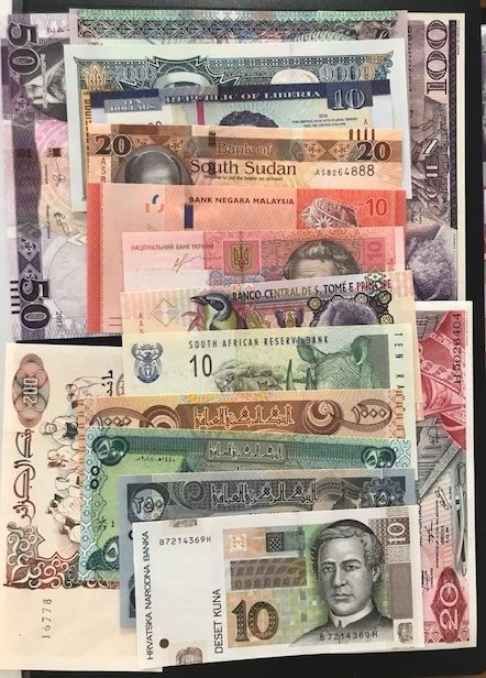 Algeria, 200 Dinars, 1992; Mongalia, 1.000 Tugrik, 2013; Malesia, 10 Ringgit, 2017; South Africa Republic, 10 Rand, 2009;
