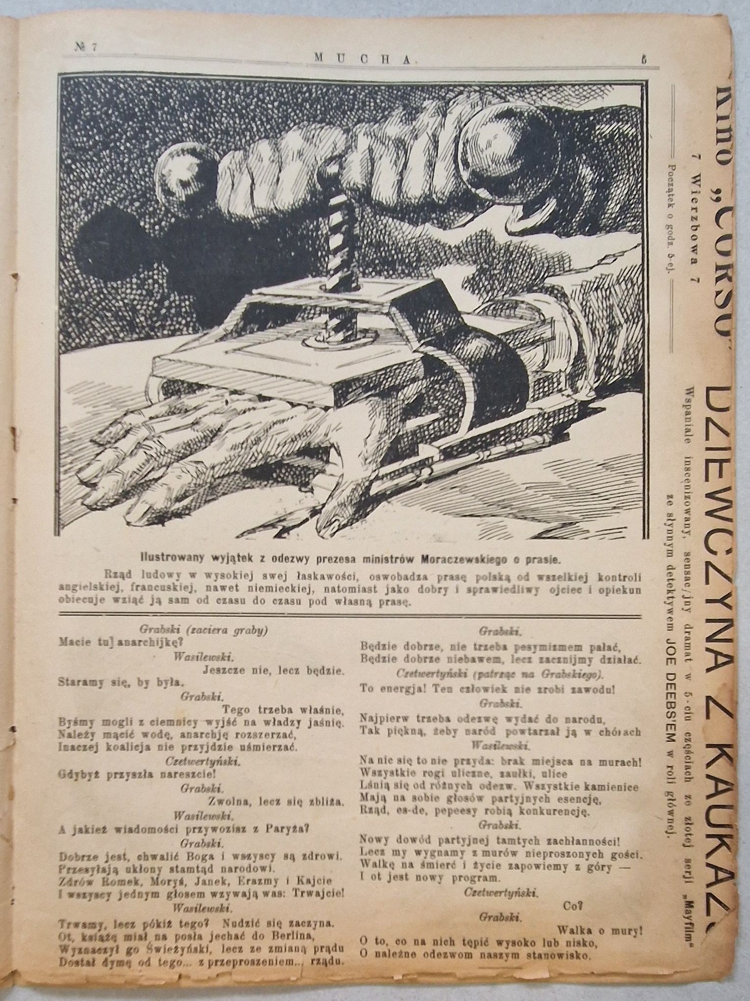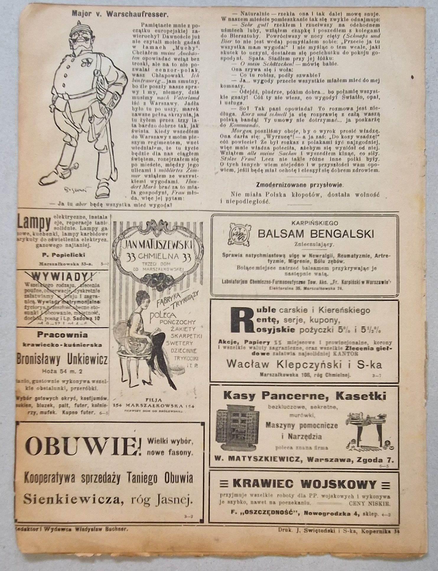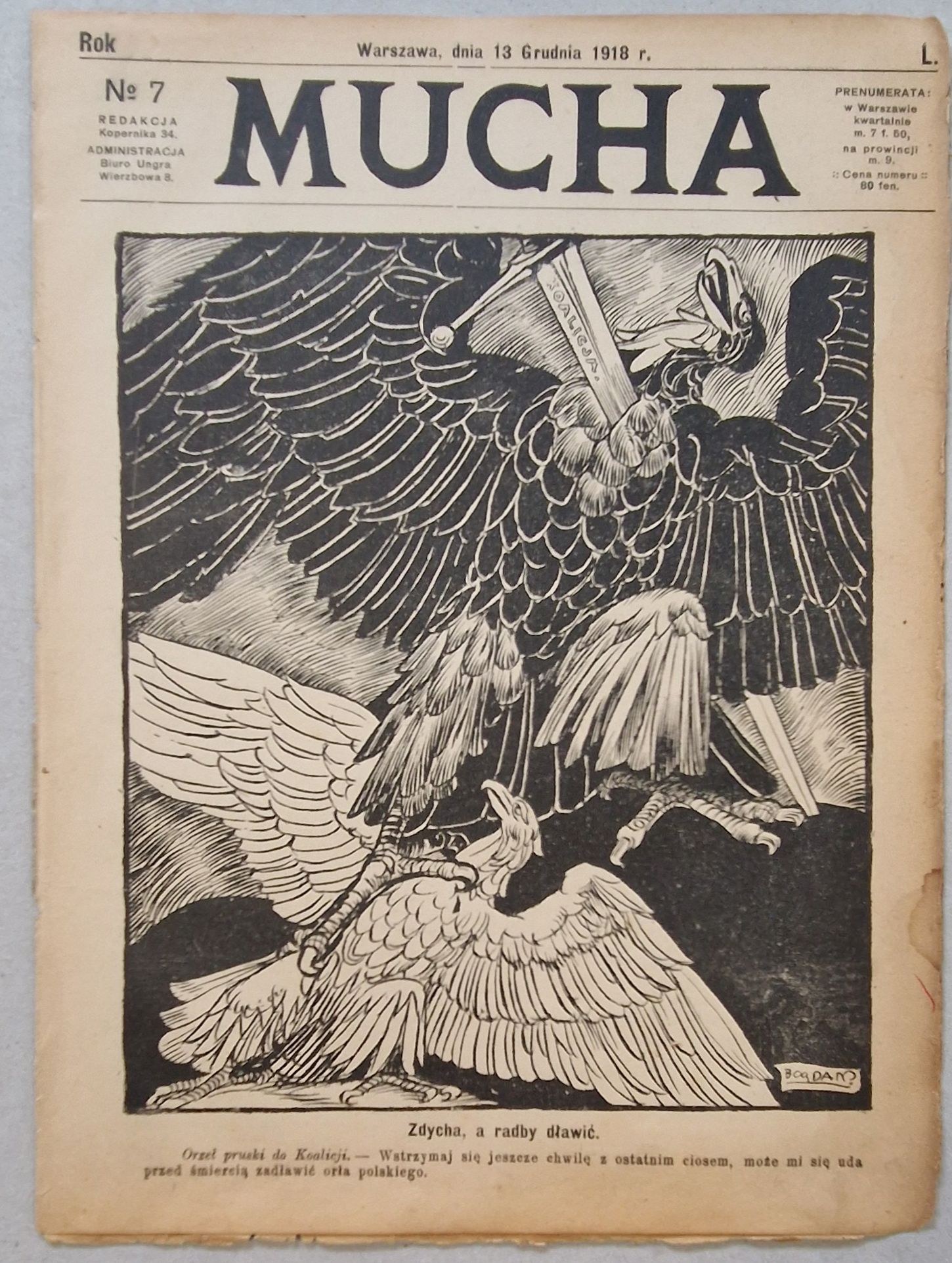 Numer 7 z pierwszego rocznika pisma wydanego w niepodległej Polsce. W roku 1918 w Warszawie ukazało się 9 numerów wznowionej Muchy. Okładkę projektował Bogdan Nowakowski (1887 - 1945) rysownik, ilustrator, współpracownik pism satyrycznych, m.in. „Kolców”, „Kuriera Świątecznego’, „Marchołta”, „Muchy”.