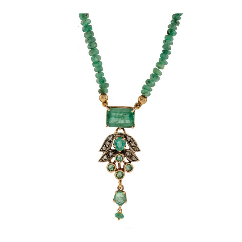 pojedyczy sznur szmaragdów fasetowanych, złoto pr. ~ 0,750, srebro, 1 szt. szmaragd ~ 2,00 ct, 2 szt. szmaragdów ł. ~ 0,43 ct, 4 szt. szmaragdów ł. ~ 0,13 ct, masa: 10,60 g; wym. zawieszki: 1,2 x 4 cm; dł.: 42 cm