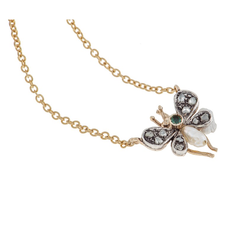 złoto pr. ~ 0,585, srebro, 1 szt. szmaragd, 1 szt. perła hodowana, rauty diamentowe, łańcuszek (wtórny): złoto pr. ~ 0,585, masa: 3,40 g; wym. zawieszki: 1,4 x 1,4 cm, dł. łańc.: 39 cm