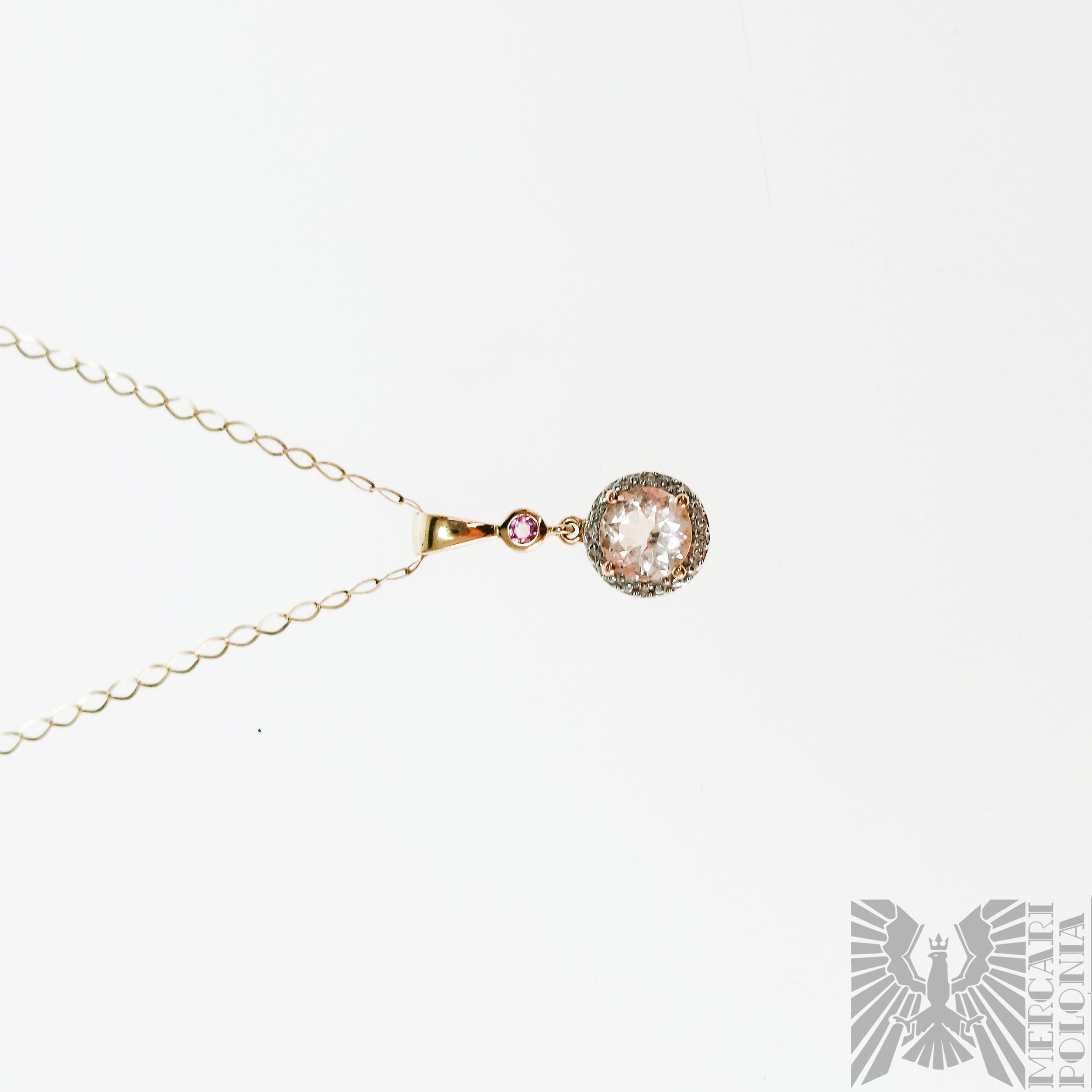 Naszyjnik z Różowym Topazem i Brylantami, Wisiorek Złoto 417/10k, Łańcuszek Złoto 417/10K, Różowy Topaz o masie około 2 Ct oraz 4 Brylanty o masie około 0.04 Ct, masa wyrobu 3.11 gram, długość łańcuszka około 46 cm, wymiary wisiorka 25x11 mm
