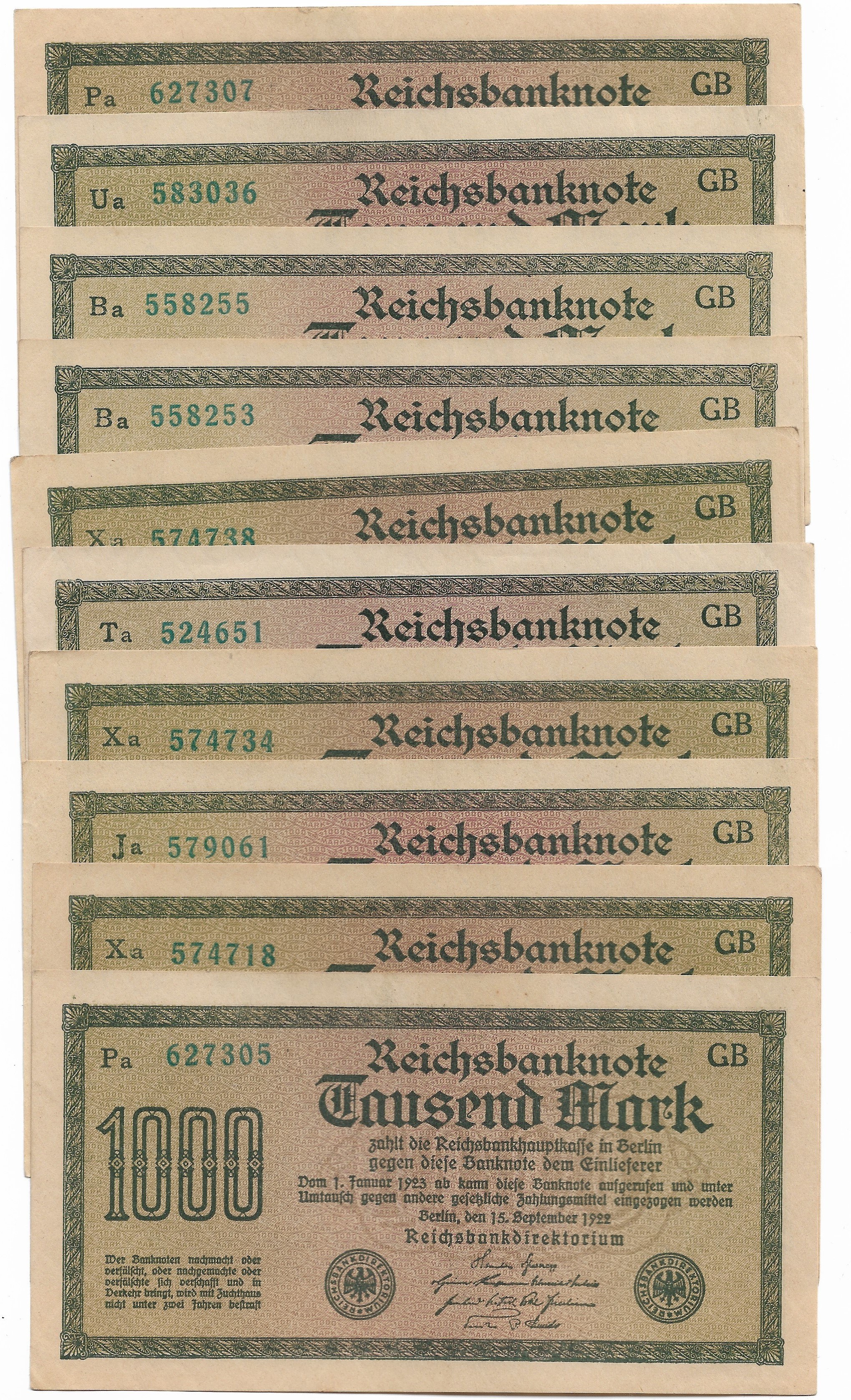 Zestaw 10 banknotów o nominale 1000 marek z 1922 roku, w przypadku banknotów z tej samej serii bliskie numery z tej samej paczki.