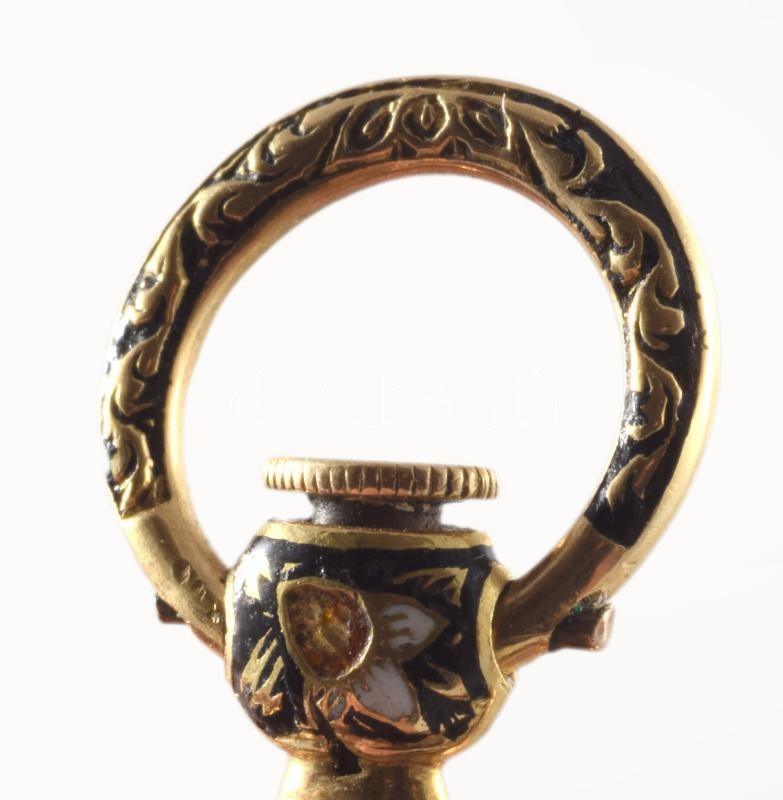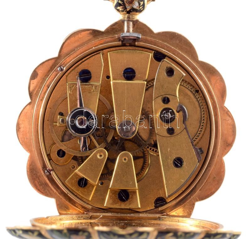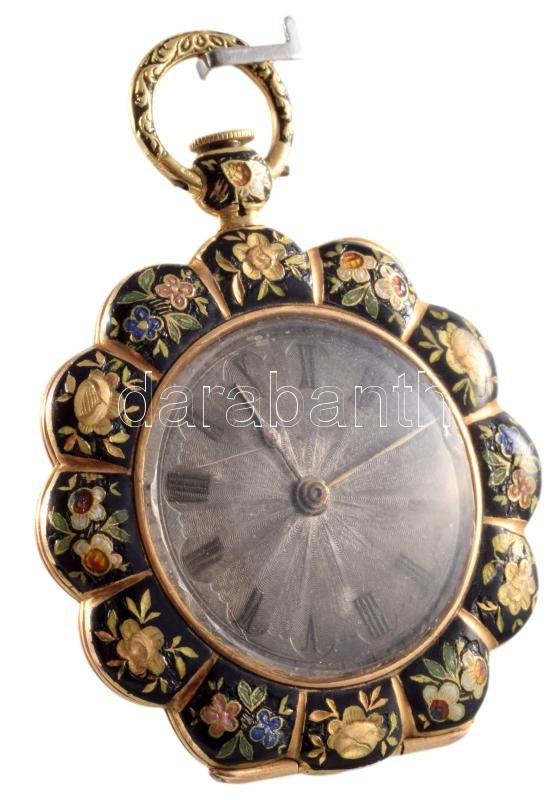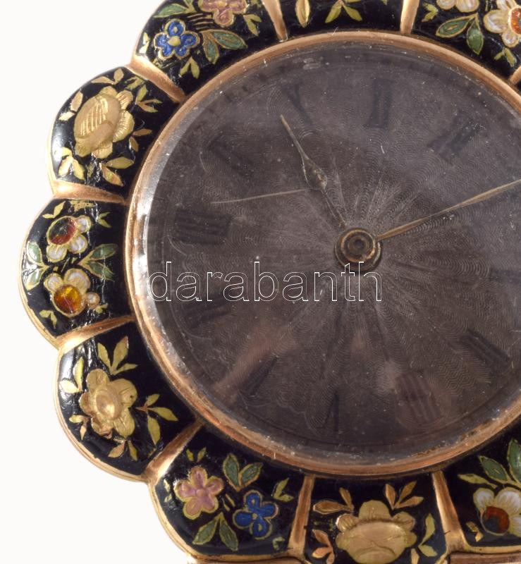 Női zsebóra. XIX. sz. közepe. 18K arany (Au) kézi zománcfestéssel. P. Aiguilles, jelzéssel, köves szerkezettel, kulccsal, működik d: 4 cm, br 27,9 g Women's pocket watch. Mid 19th century. 18K gold (Au) with hand enamel painting. P. Aiguilles, marked, stone mechanism, with key, works d: 4 cm, br 27.9 g
