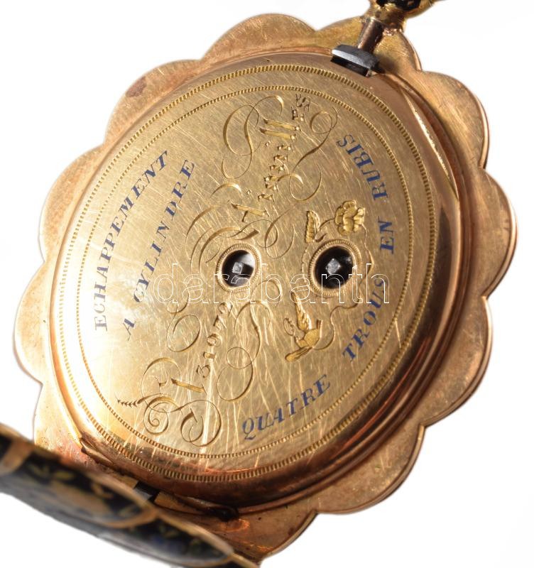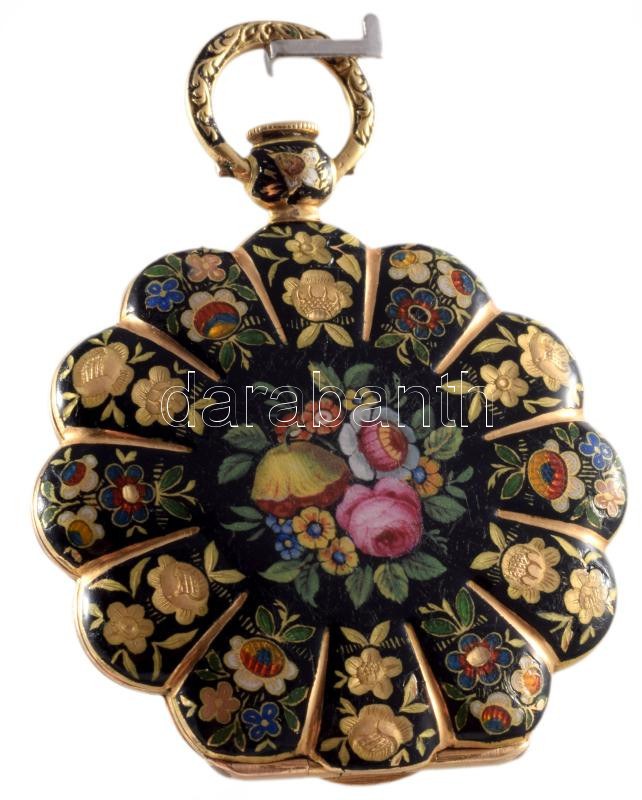 Női zsebóra. XIX. sz. közepe. 18K arany (Au) kézi zománcfestéssel. P. Aiguilles, jelzéssel, köves szerkezettel...