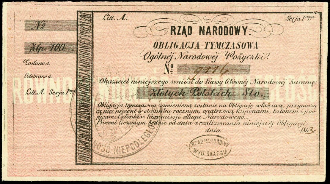Powstanie Styczniowe 1863-1864, obligacja tymczasowa Ogólnej Narodowej Pożyczki na kwotę 100 złotych 1863, dwie pieczęcie, Lucow 210 (R2), Moczydłowski S4