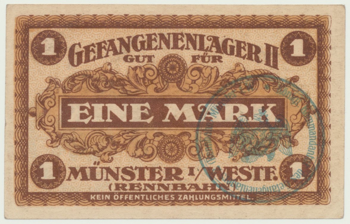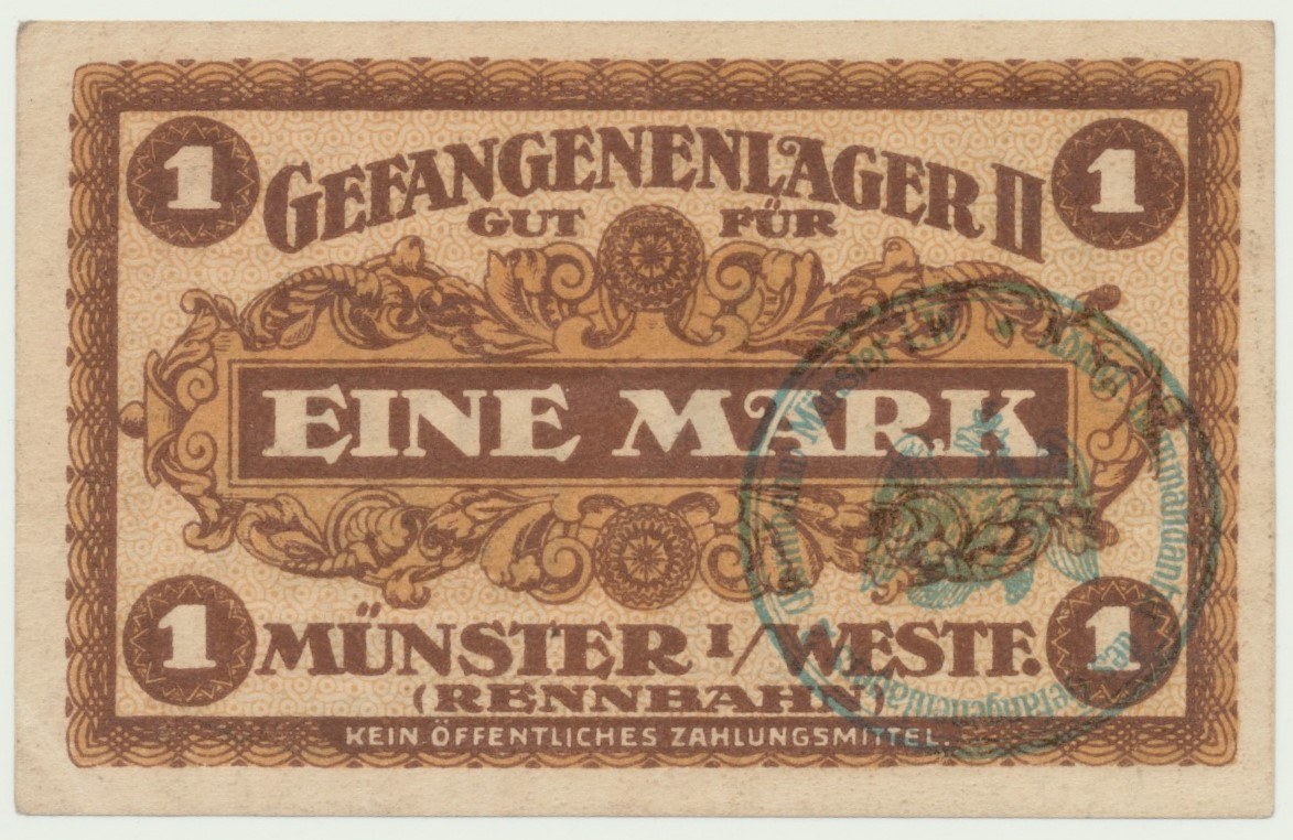1 marka bez daty, obóz jeniecki II w Müster i. W., z inną pieczęcią obozu na obu stronach banknotu.