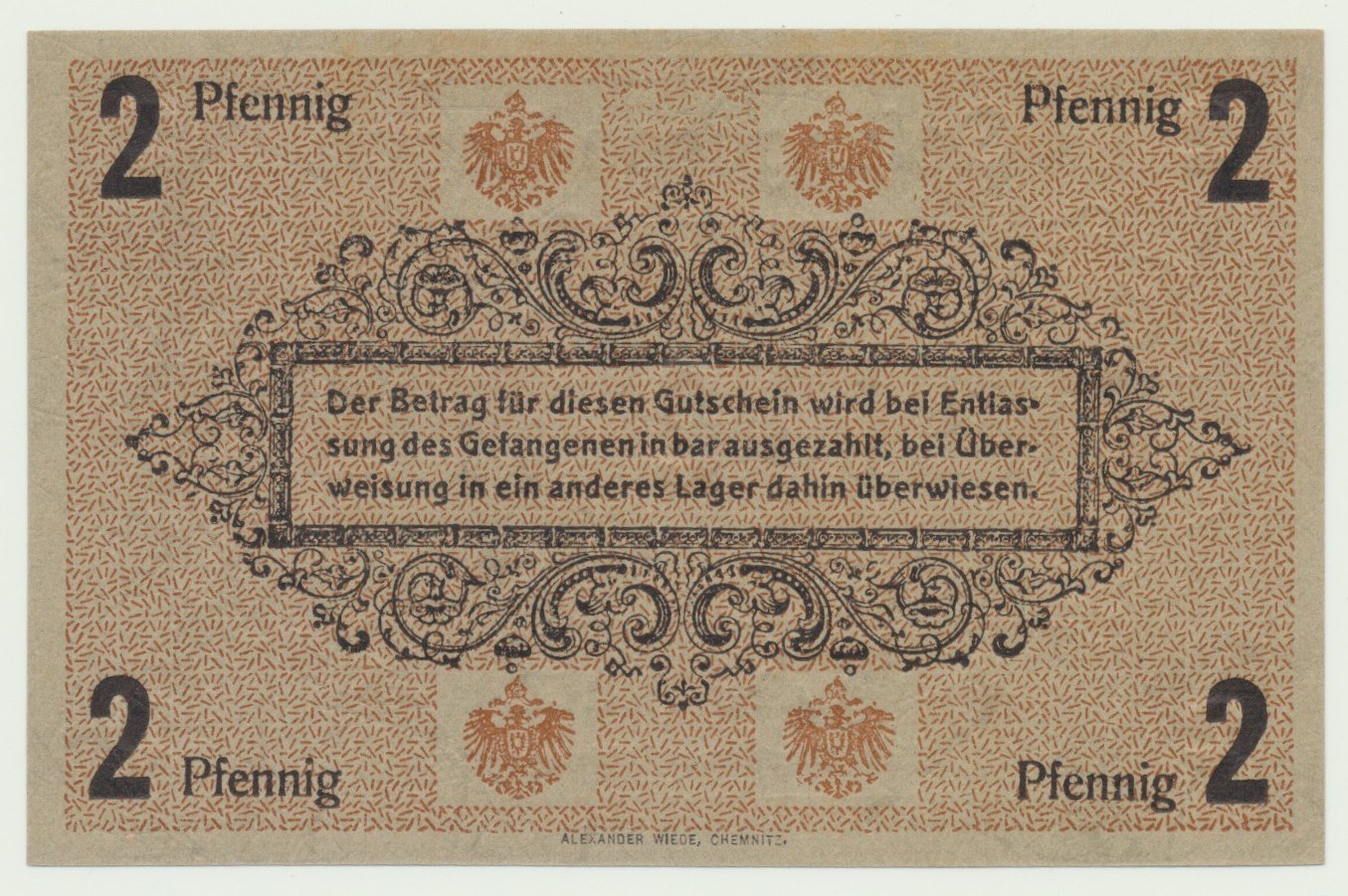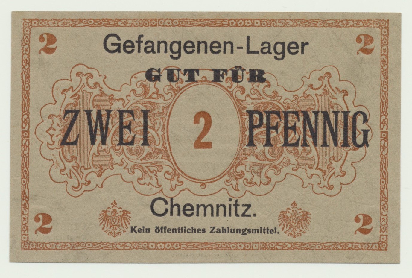 2 fenigi bez daty, obóz jeniecki w Chemnitz, bez pieczęci obozu. Bankowy egzemplarz.