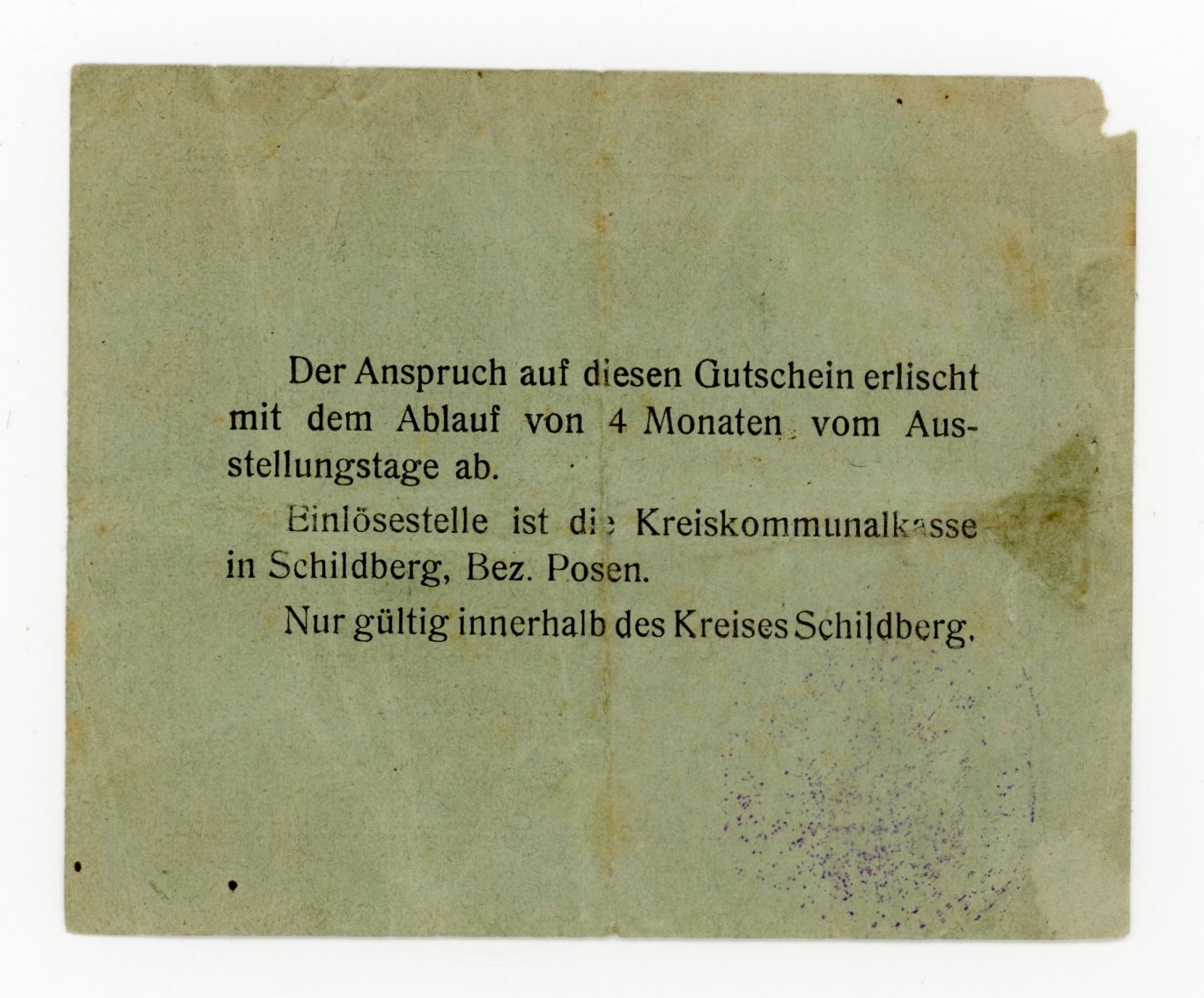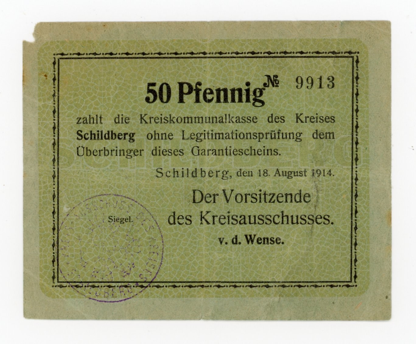 Ostrzeszów/Schildberg, 50 fenigów 1914. Stan zachowania 4. Ubytek górnego rogu. Kilkukrotnie złamane. Literatura: Podczaski P-213/A/1a