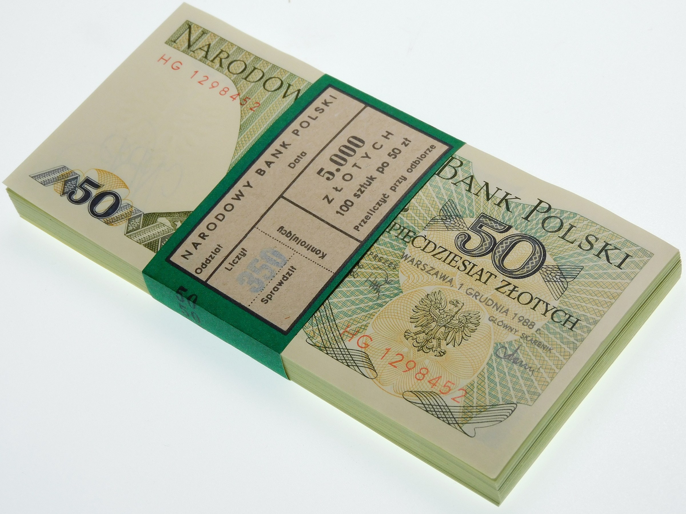 Oryginalna paczka bankowa zawierająca 100 sztuk banknotów 50 złotych 1988 serii HG - numeracja w paczcie sekwencjami kolejna.