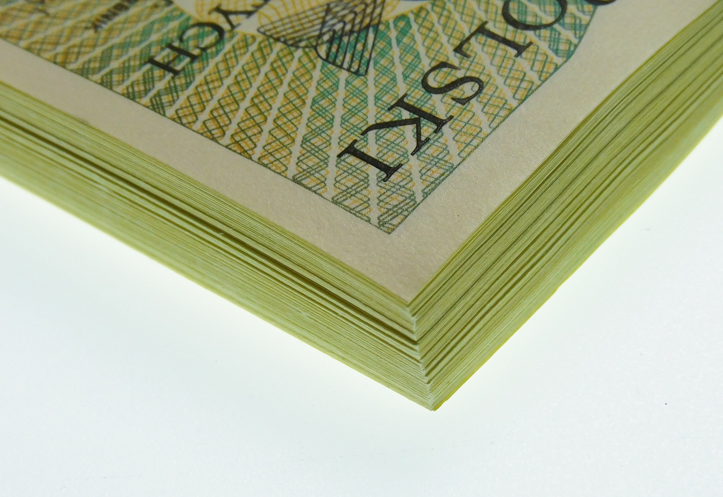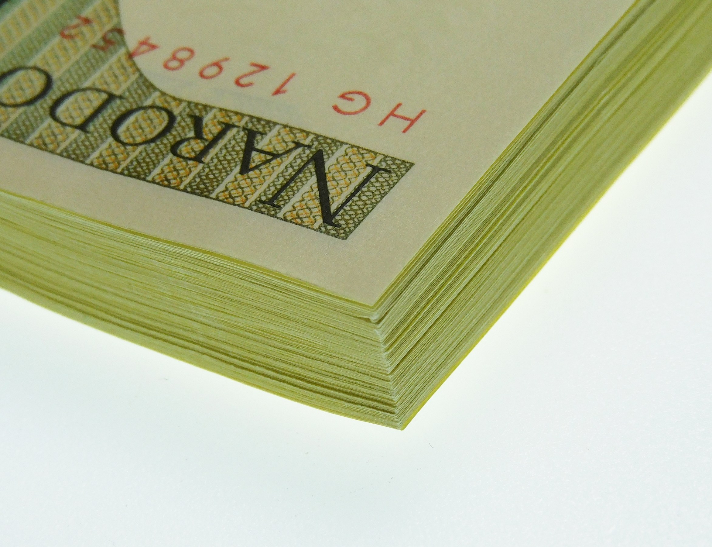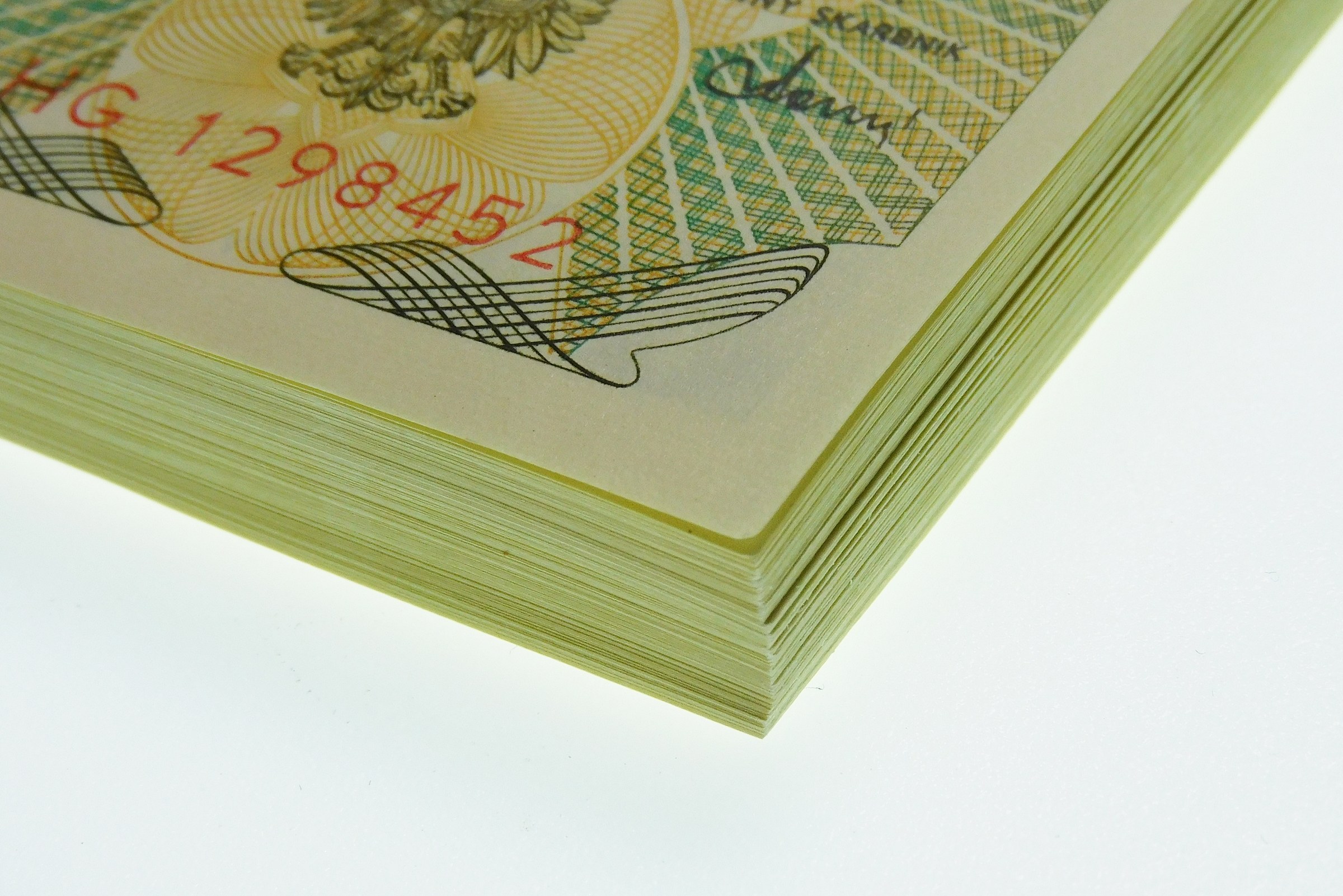 Banknoty w paczce w stanie bankowym, delikatnie niedoskonałości na samych końcówkach narożników, banderola w idealnej kondycji.
