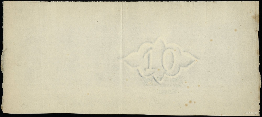Powstanie Styczniowe 1863-1864, papier do druku banknotu 10 złotych z 1863 roku; ze znakiem wodnym “10” w rozecie, format 252x112 mm; Miłczak -, Lucow - nie notuje; papier lekko zaplamiony na bocznych marginesach, ale bez bardzo ładnie zachowany, nie mający wpływu na jego wybitną rzadkość, stempel “z księgozbioru Piotra Umińskiego w Warszawie” oraz adnotacja tuszem “69 G”, banknoty z Powstania Styczniowego nie są znane, gdyż cały nakład został zniszczony - pozostały jedynie projekty, płyty do druku i papier ze znakami wodnymi