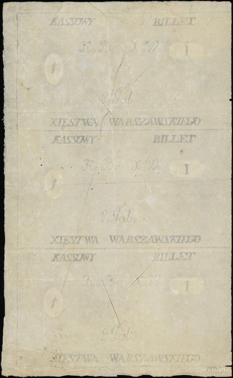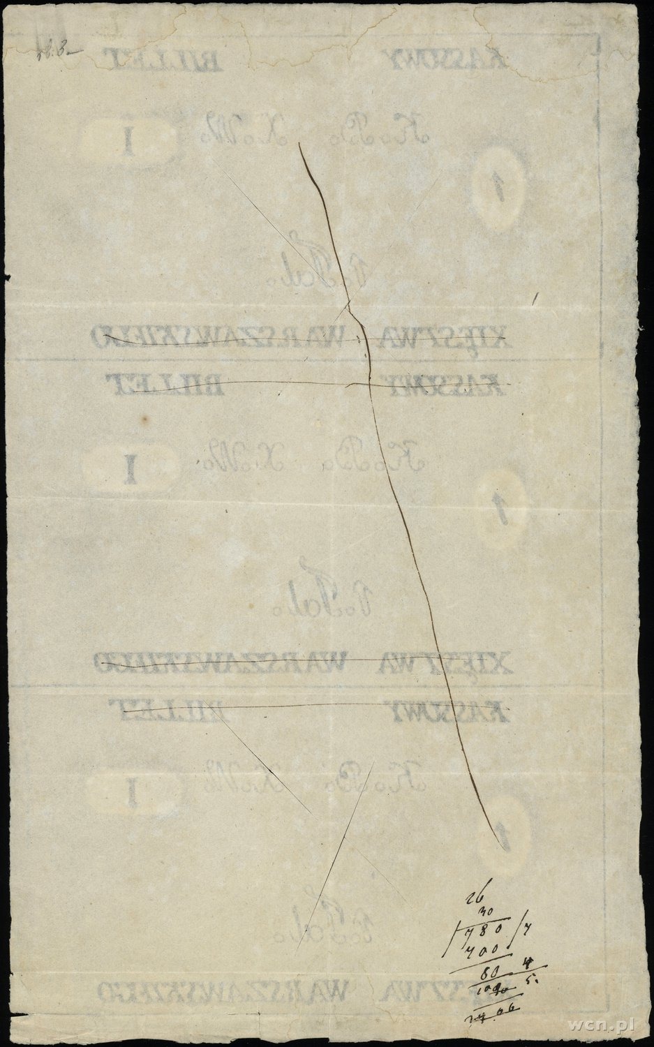 Księstwo Warszawskie 1807-1815, papier ze znakami wodnymi do druku 3 x 1 talar Księstwa Warszawskiego; skasowany - dwa przecięcia nożem na krzyż i przekreślenia tuszem, format 308x190 mm; Lucow 78 (R8), Miłczak - patrz A12; lewa część arkusza drukarskiego, z którego drukowano 6 sztuk (2 x 3) banknotów, zaplamienia u góry, adnotacje tuszem u dołu na odwrocie, postrzępienia marginesów, ale bardzo rzadkie
