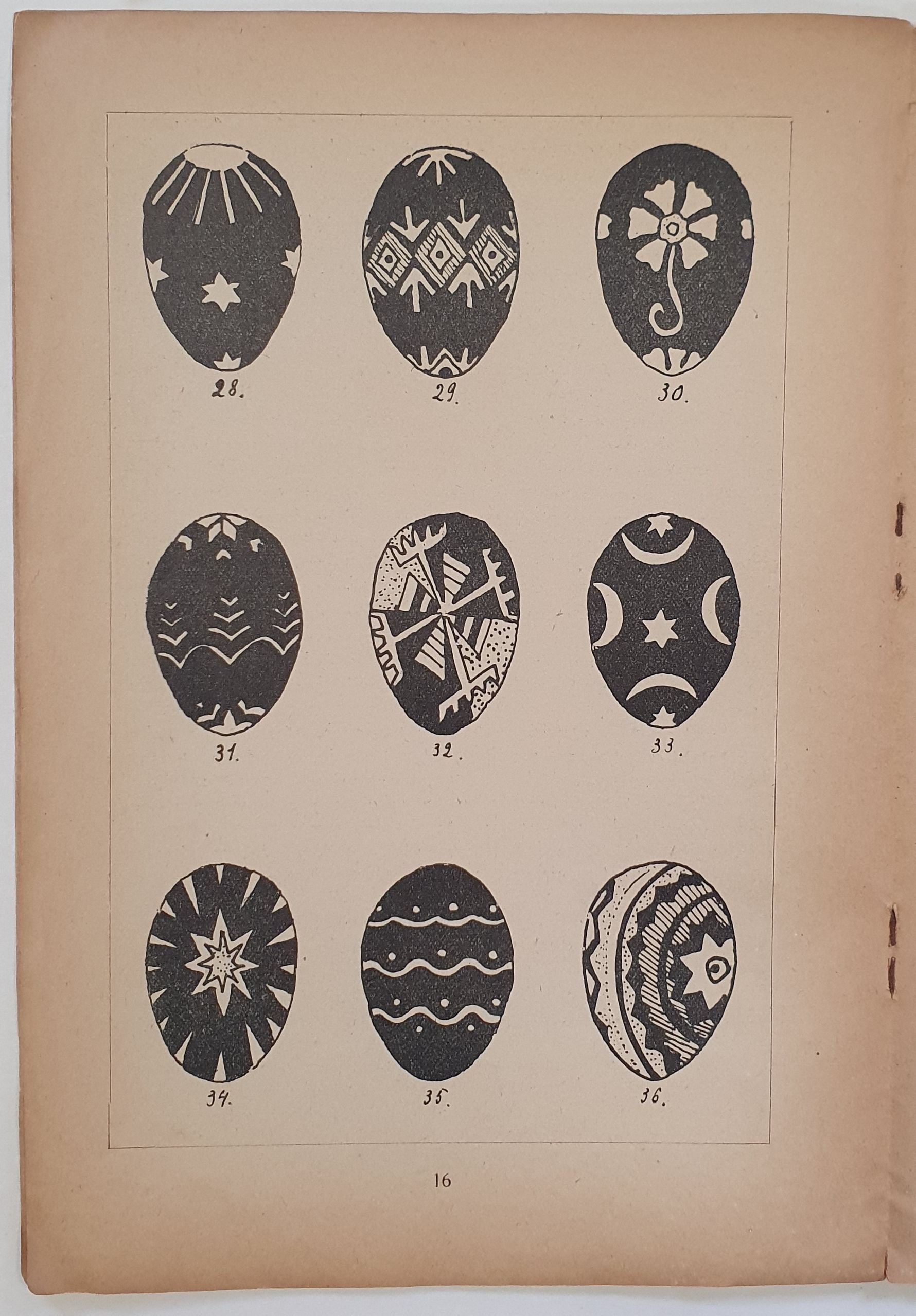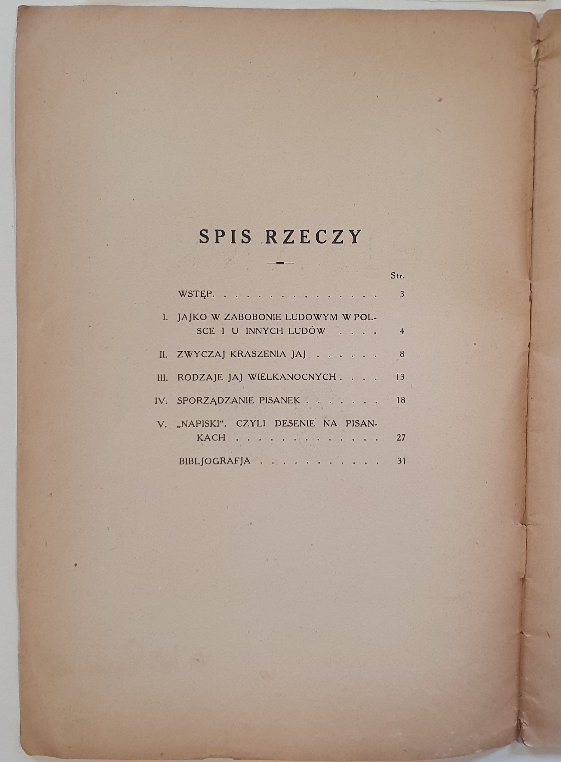Spis rzeczy: I. Jajko w zabobonie ludowym w Polsce i u innych ludów. II. Zwyczaje kraszenia jaj. III. Rodzaje jaj wielkanocnych. IV. Sporządzanie pisanek. V. „Napiski”, czyli desenie na pisankach. Ilustracje czarno-białe 72 wzory zdobienia jaj na 8. tablicach.