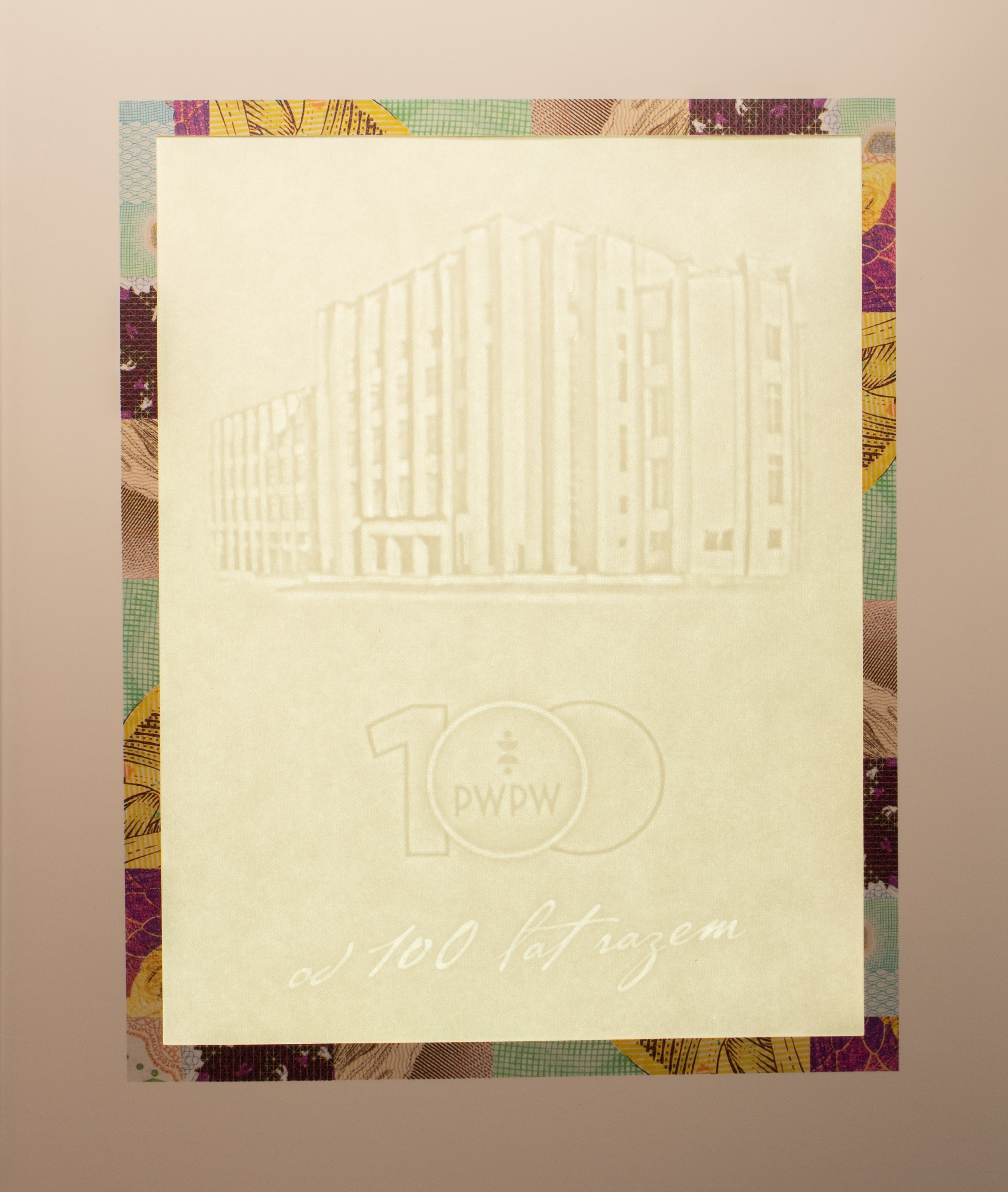 Prospekt reklamowy zawierający okolicznościowy znak wodny wydany z okazji 100 LAT PWPW. Format prospektu A4, stan wyśmienity.