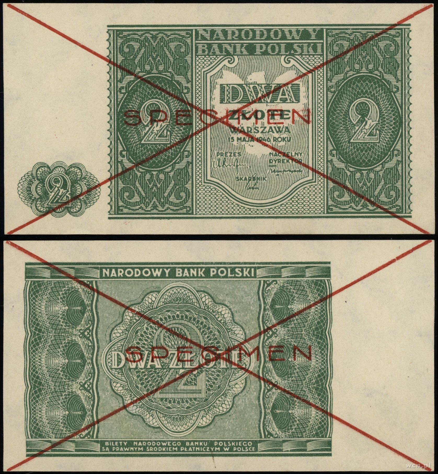 bez serii i numeracji, obustronnie dwukrotne przekreślenie i nadruk poziomy SPECIMEN