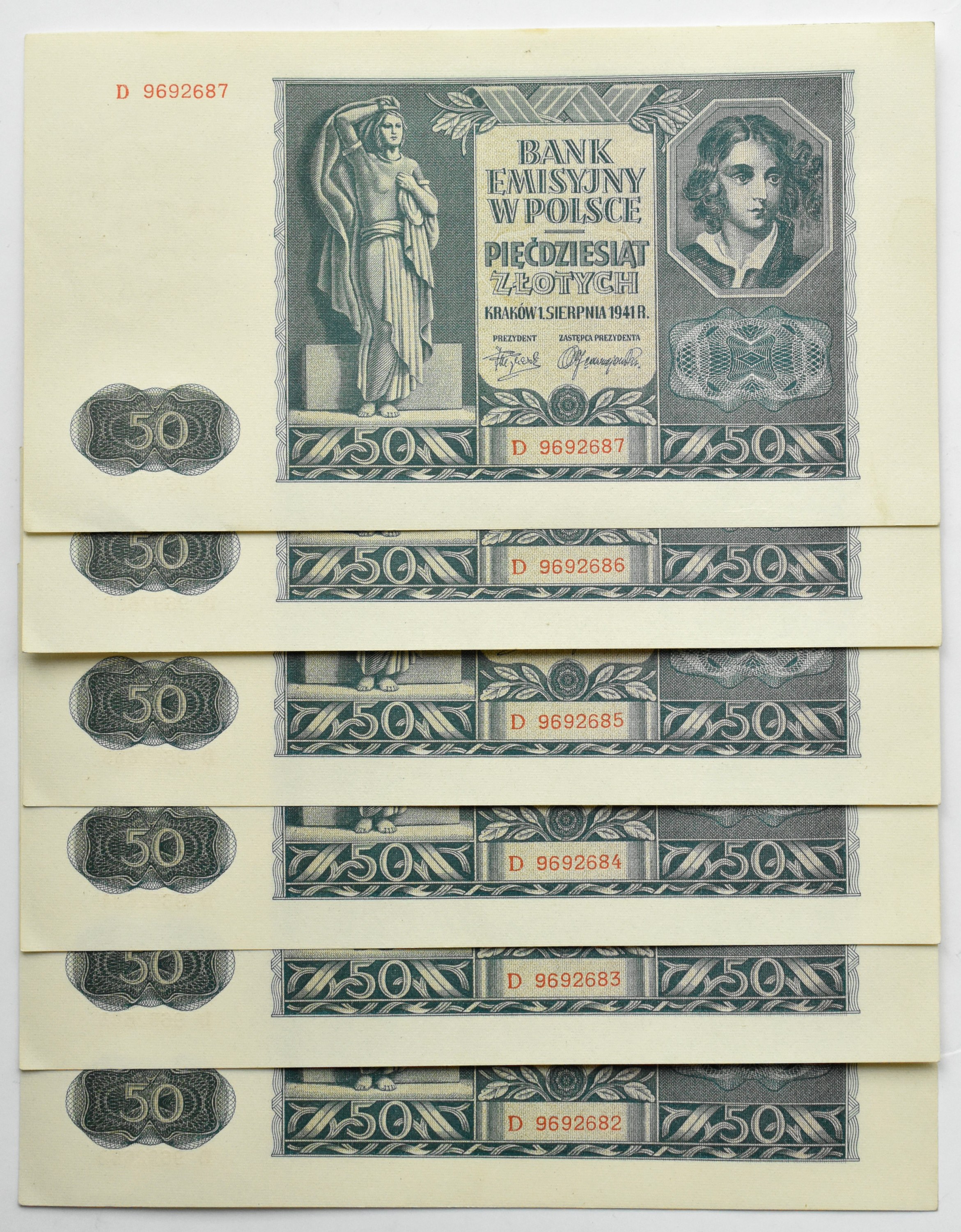Polska, Generalna Gubernia, 50 złotych 1941, seria D, 6 sztuk kolejnych numerów, UNC