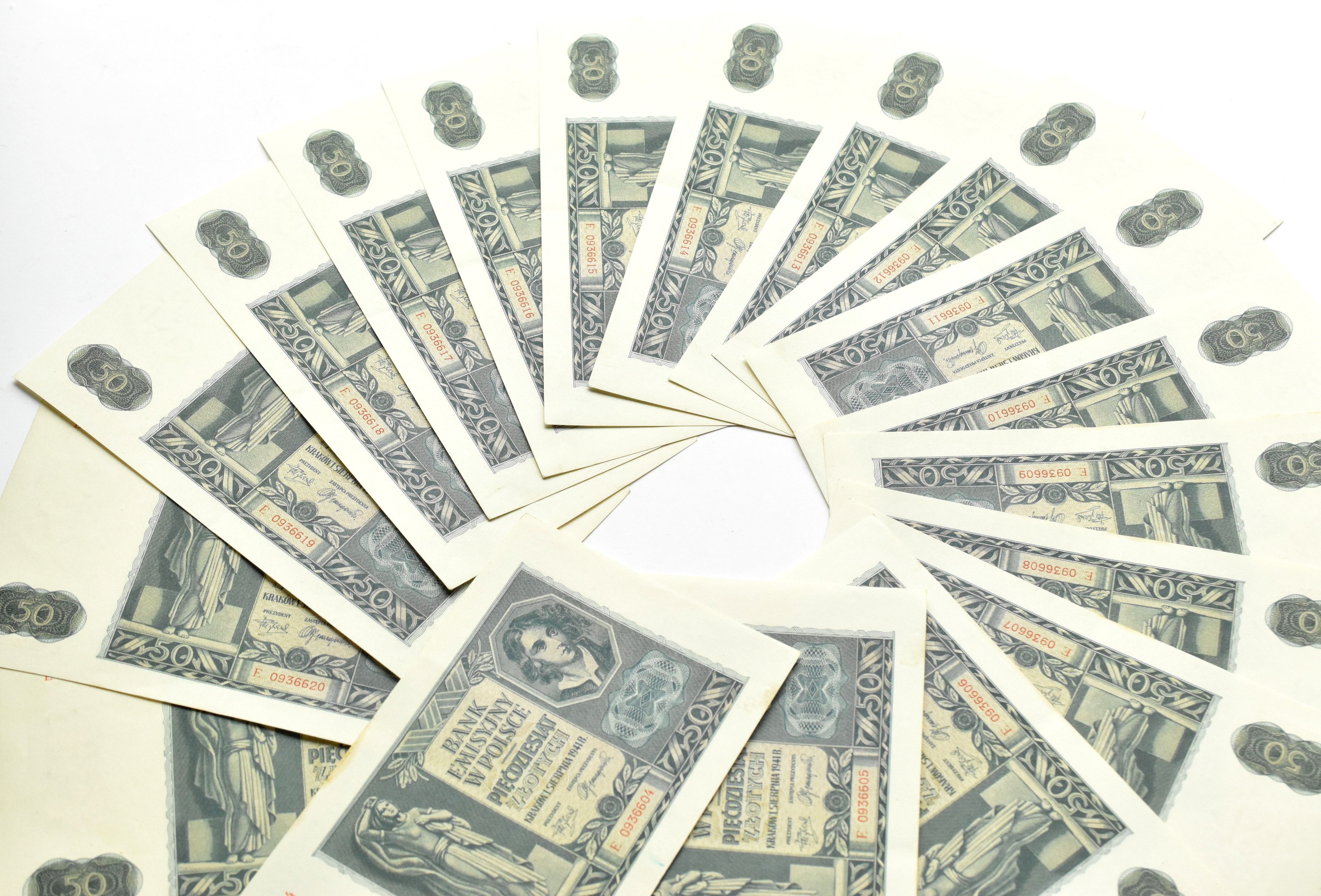 19 sztuk banknotów, kolejne numery E 0936604-0936621