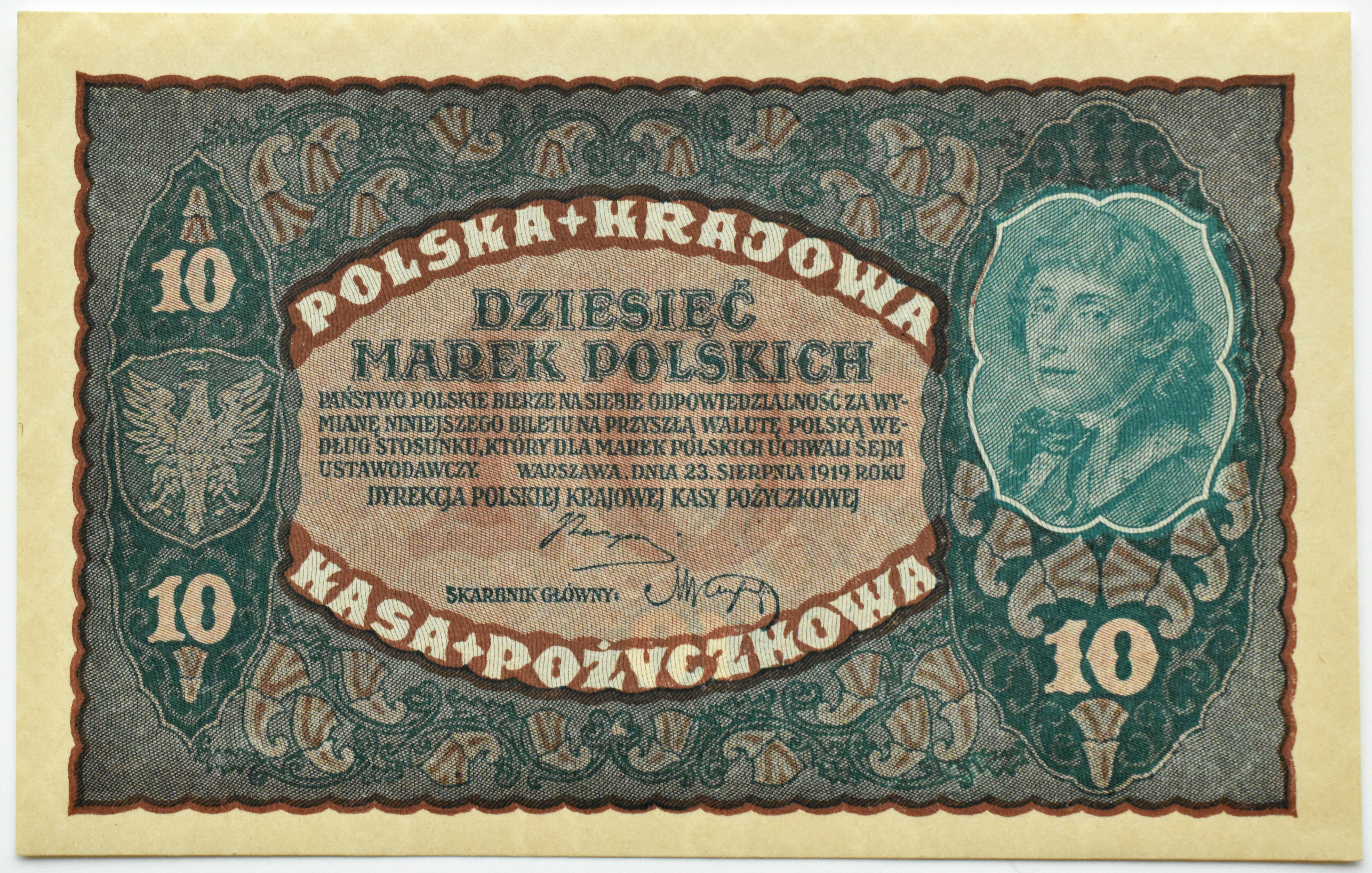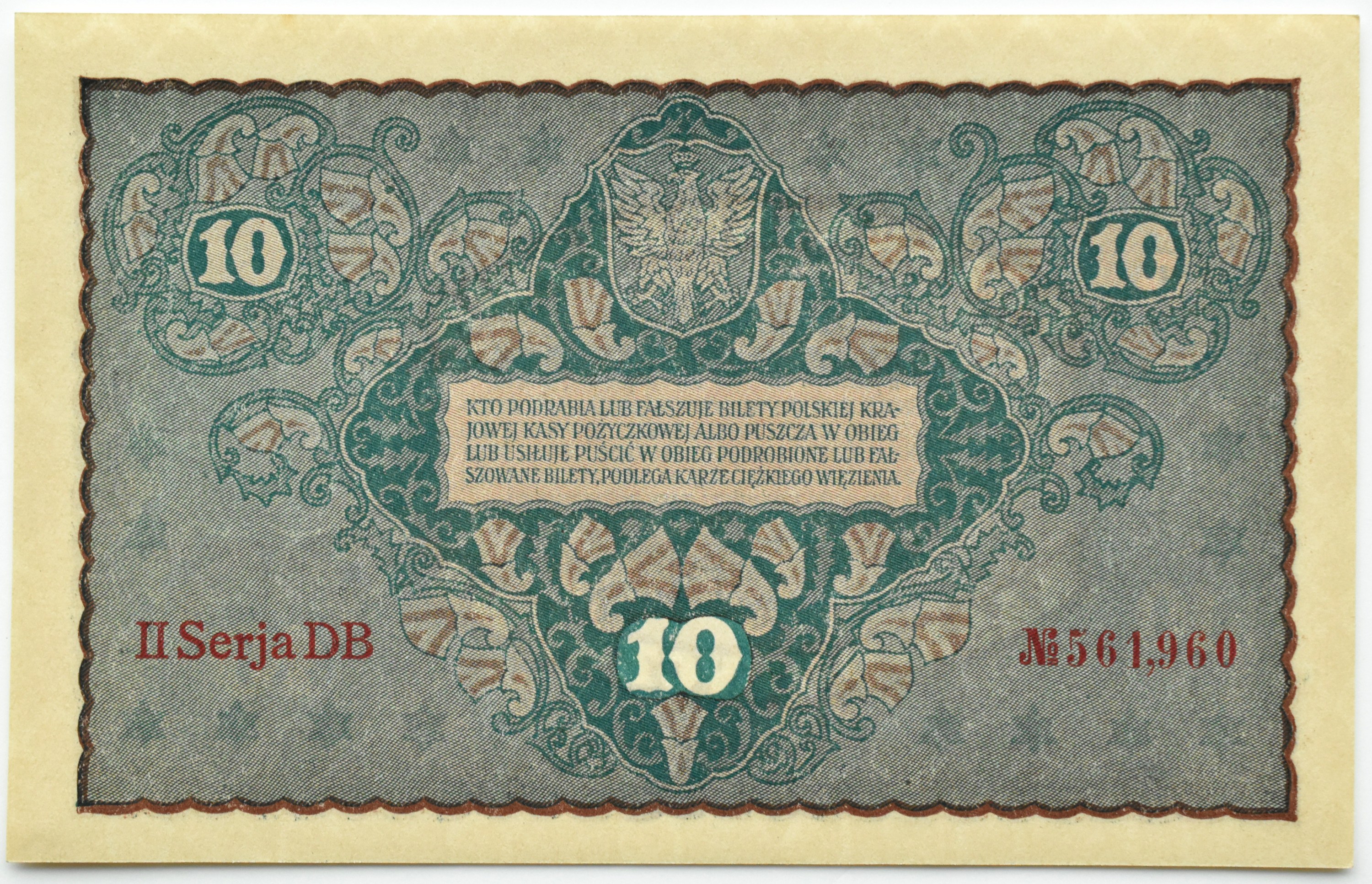 Polska, II RP, 10 marek 1919, II seria DB, Warszawa, UNC