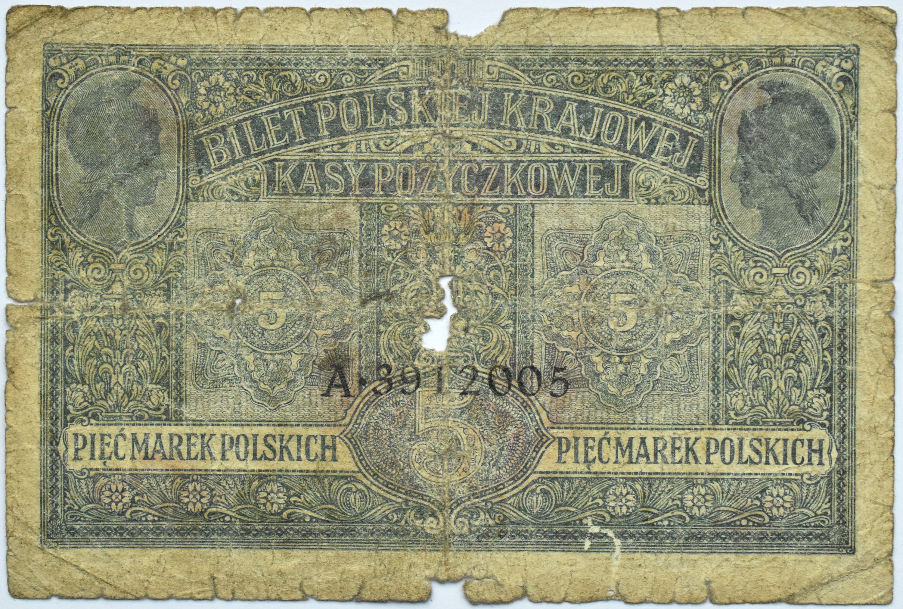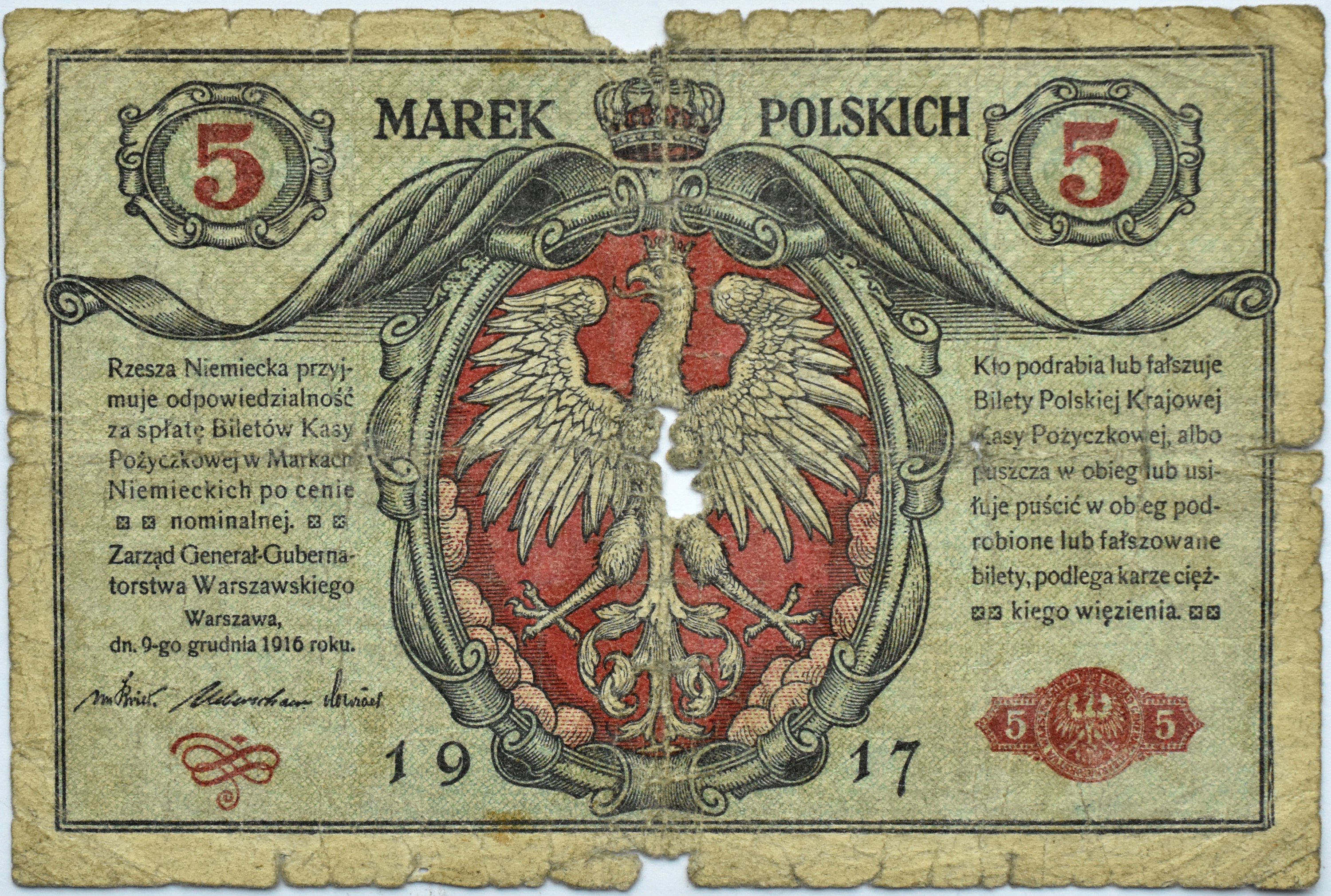 Polska, II RP, 5 marek 1916 "Biletów"...."Generał" - rzadkie!