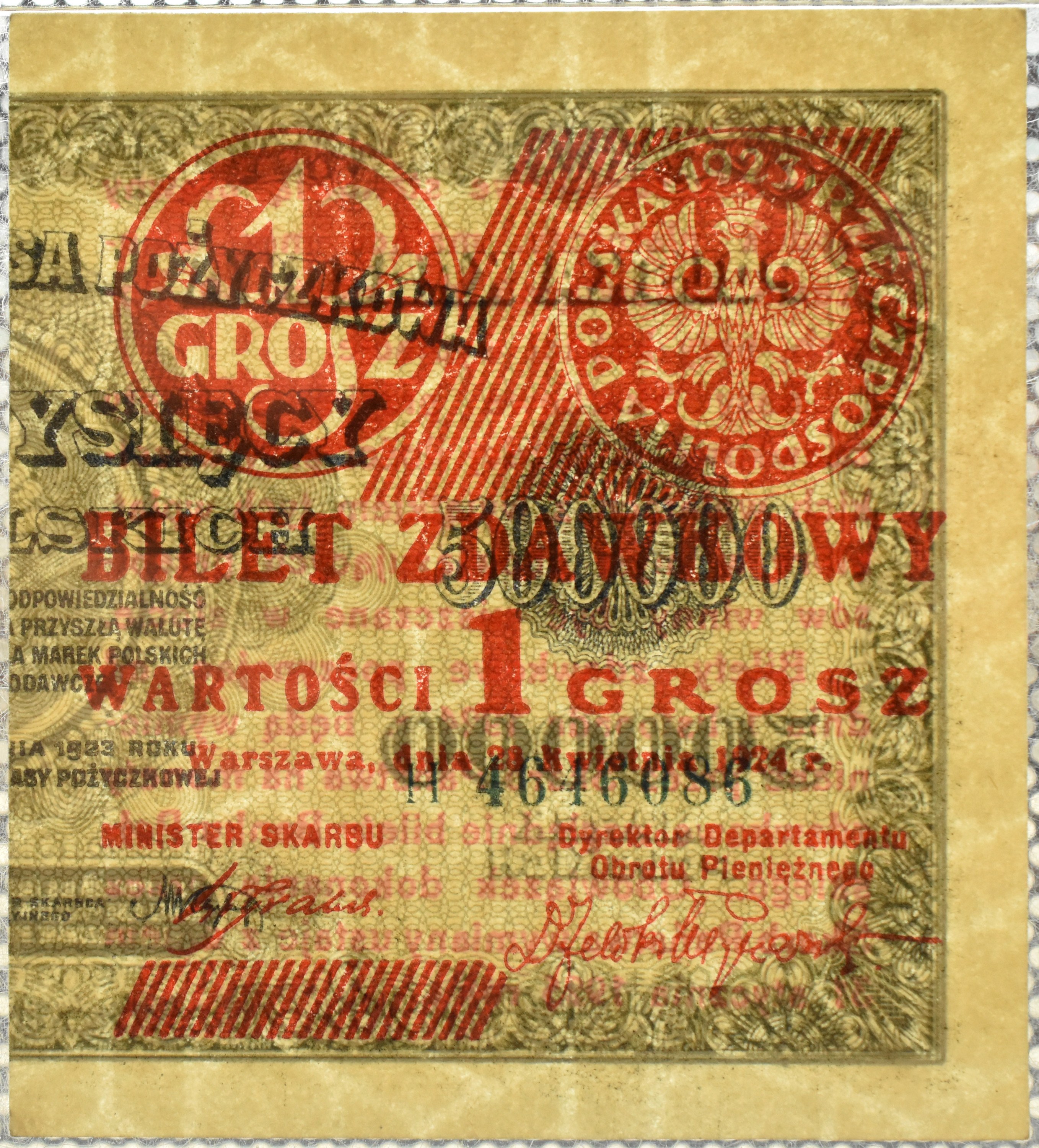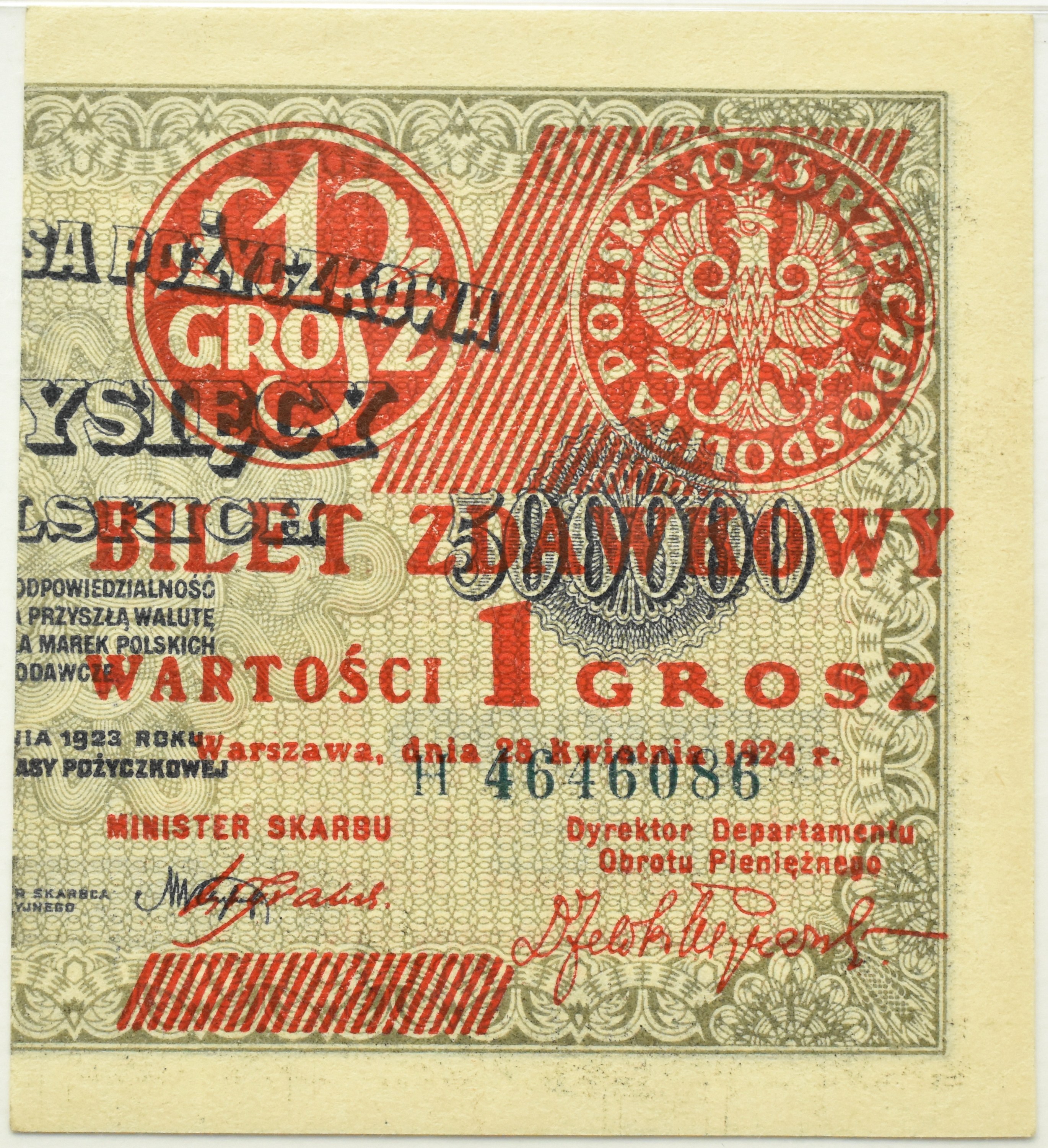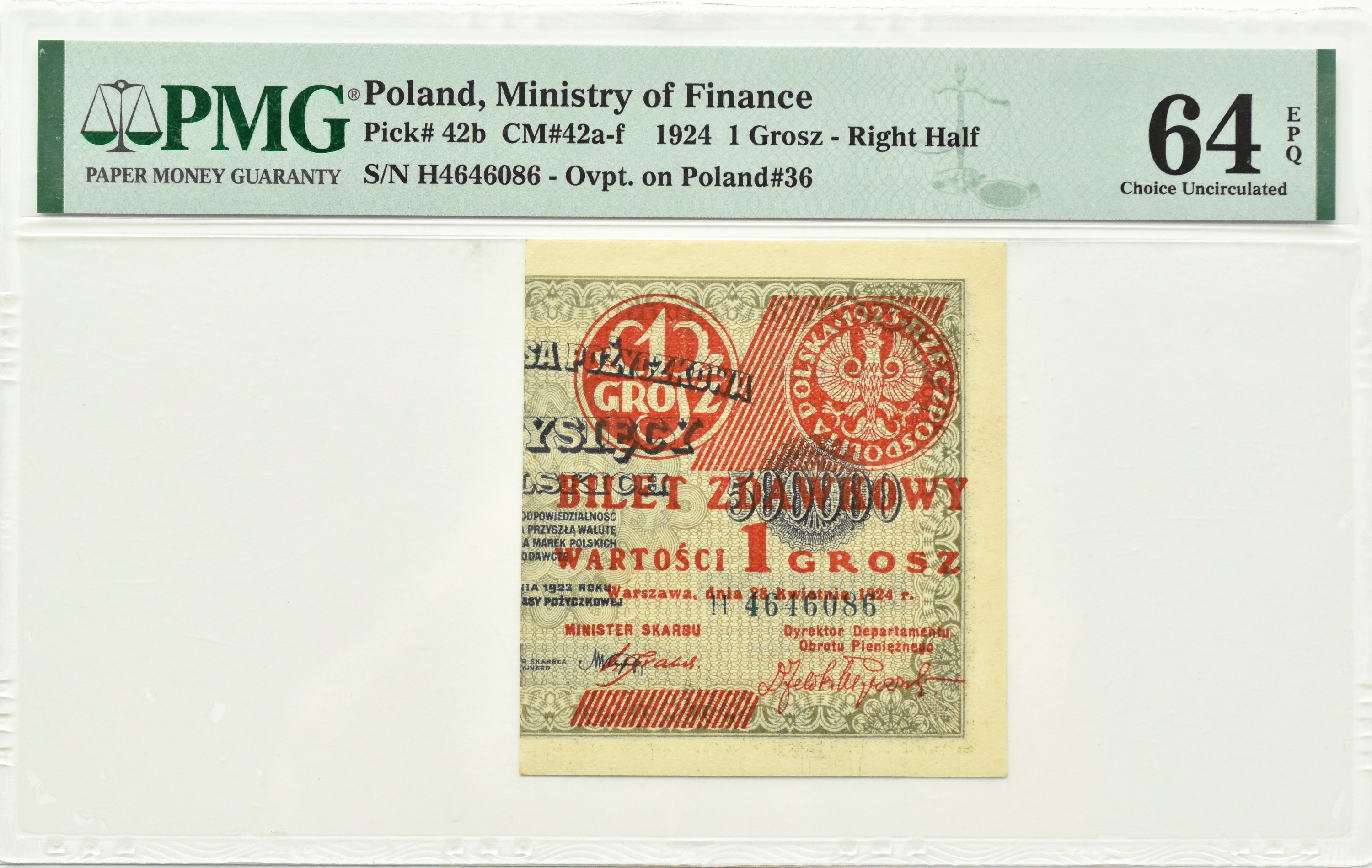 Polska, II RP, bilet zdawkowy, 1 grosz 1924 seria H (prawa połówka), PMG 64 EPQ