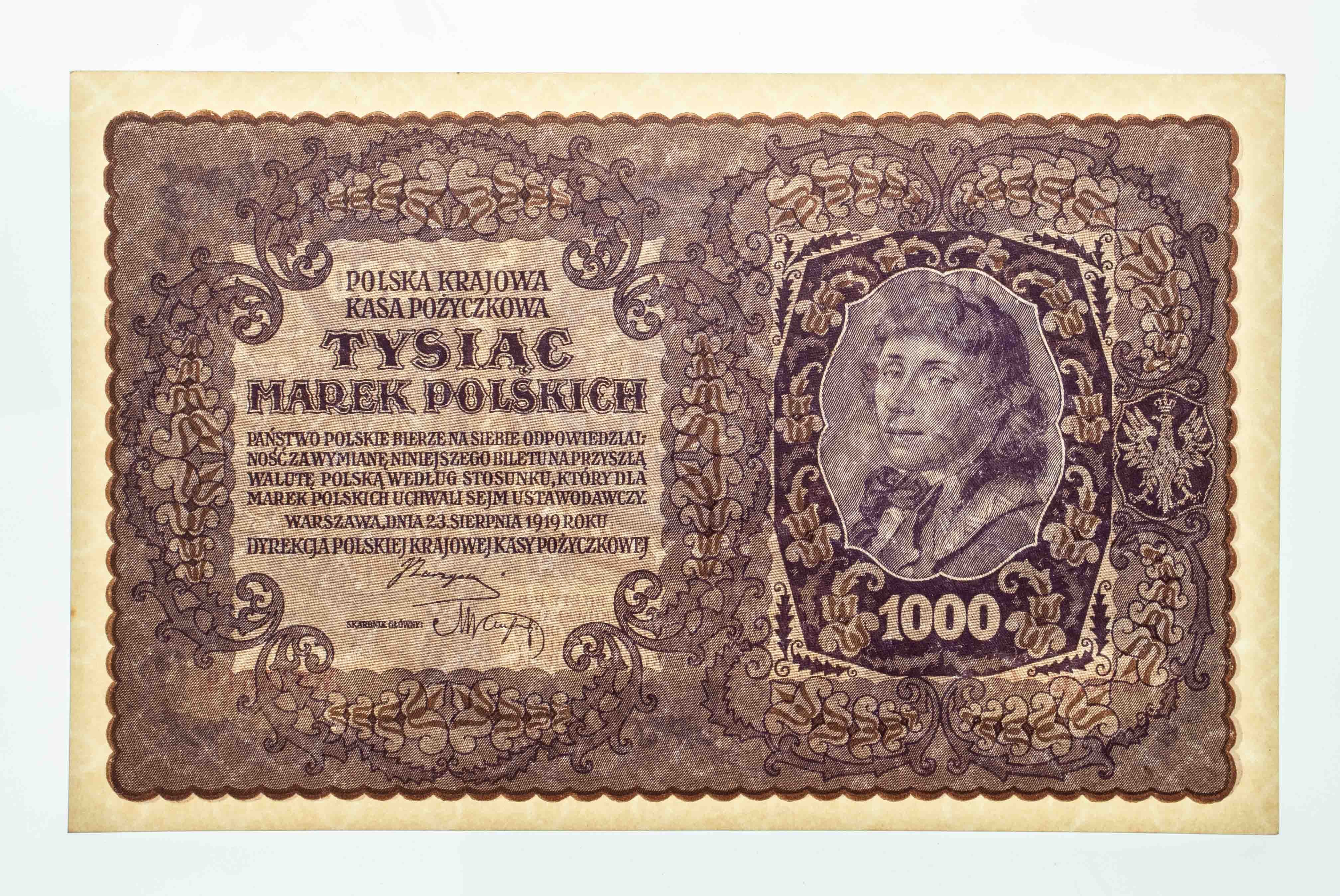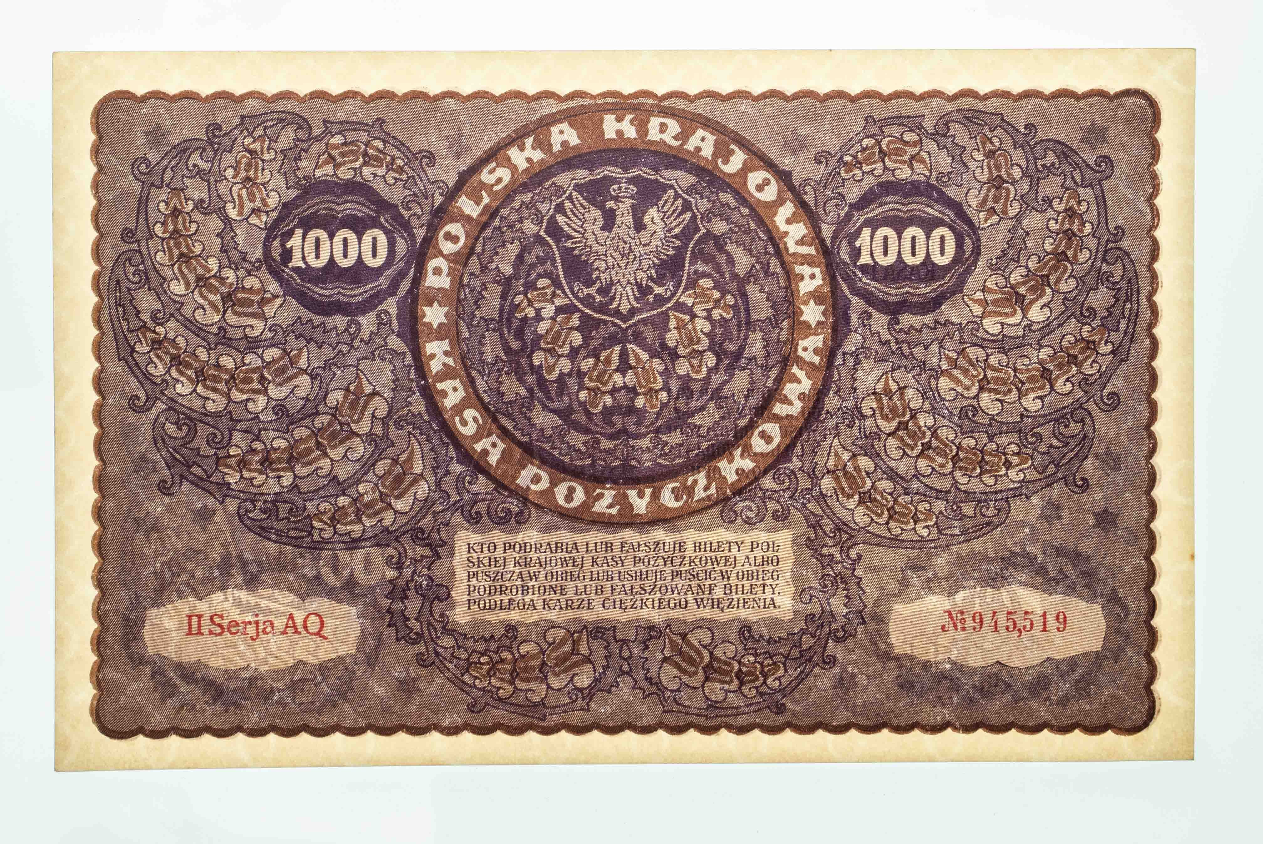 Pięknie zachowany banknot. Minimalnie ruszone narożniki, szerokie ugięcia przy narożnikach. II Serja AQ 945,519. Odmiana z przecinkiem w numeratorze.