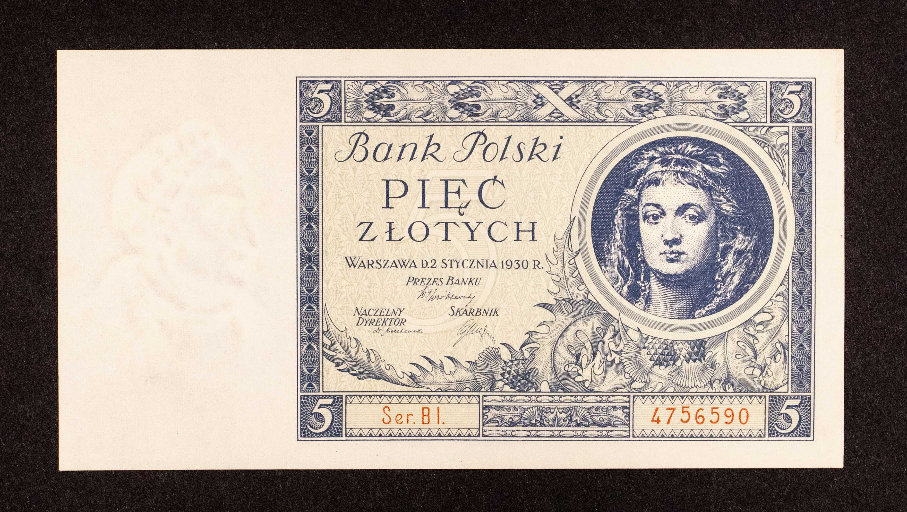 Banknot złamany w pionie i w poziomie, kilka ugięć, papier sztywny i szeleszczący. Seria BI. 4756590.