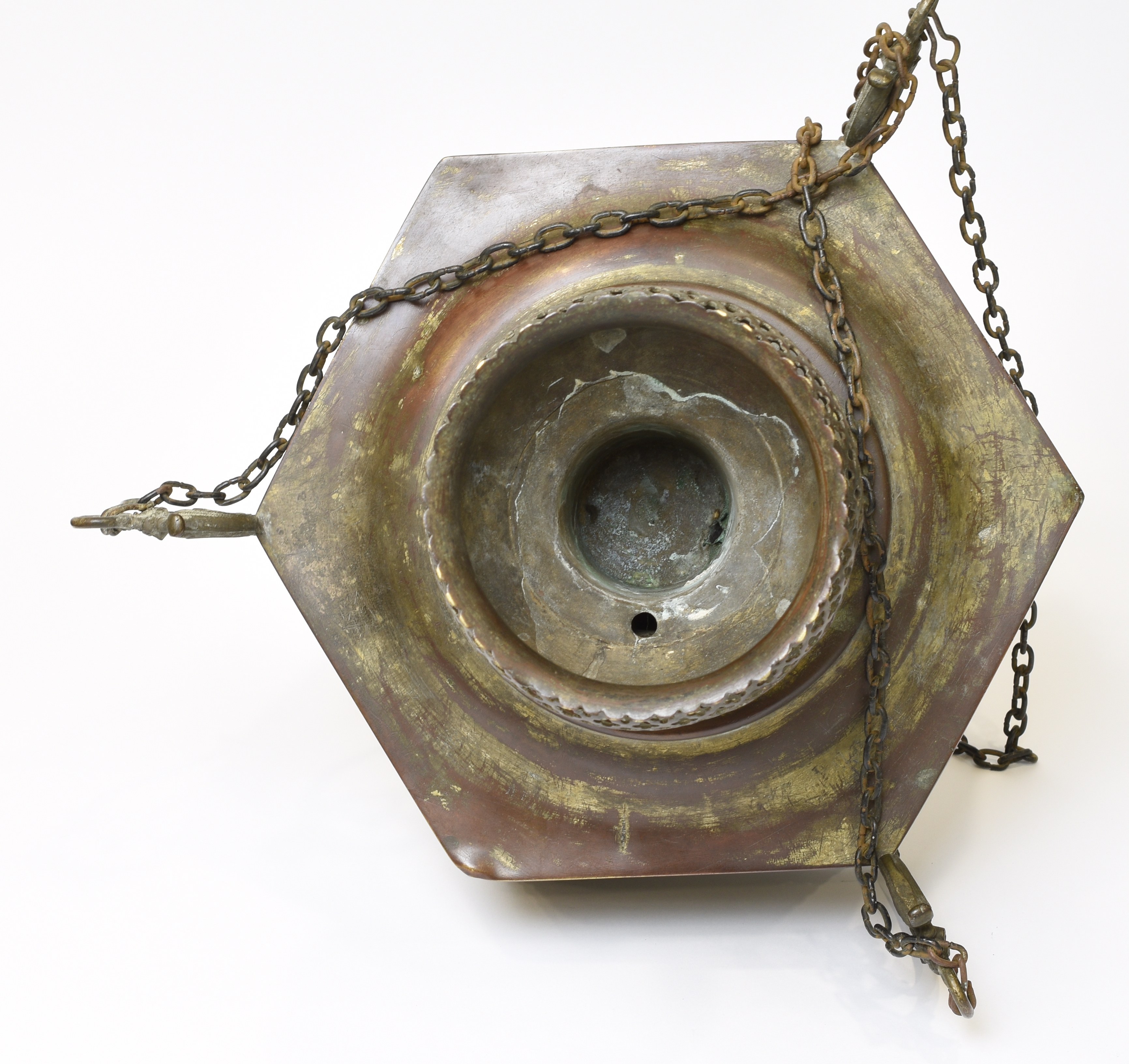 Mosiądz platerowany, wymiary ~32 x 32 x 42 cm, z łańcuchem ~78 cm