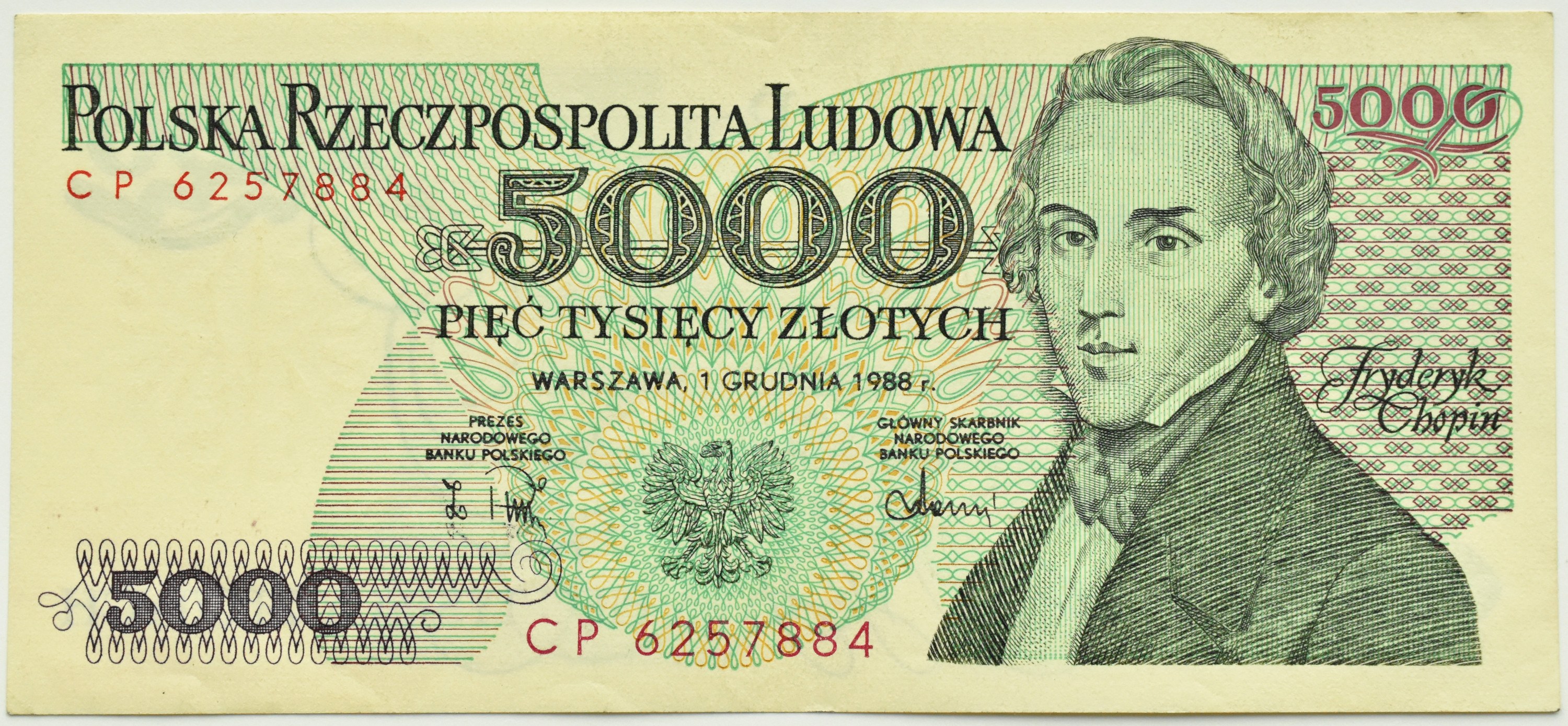 Polska, PRL, Fryderyk Chopin, 5000 złotych 1988, seria CP, Warszawa, UNC