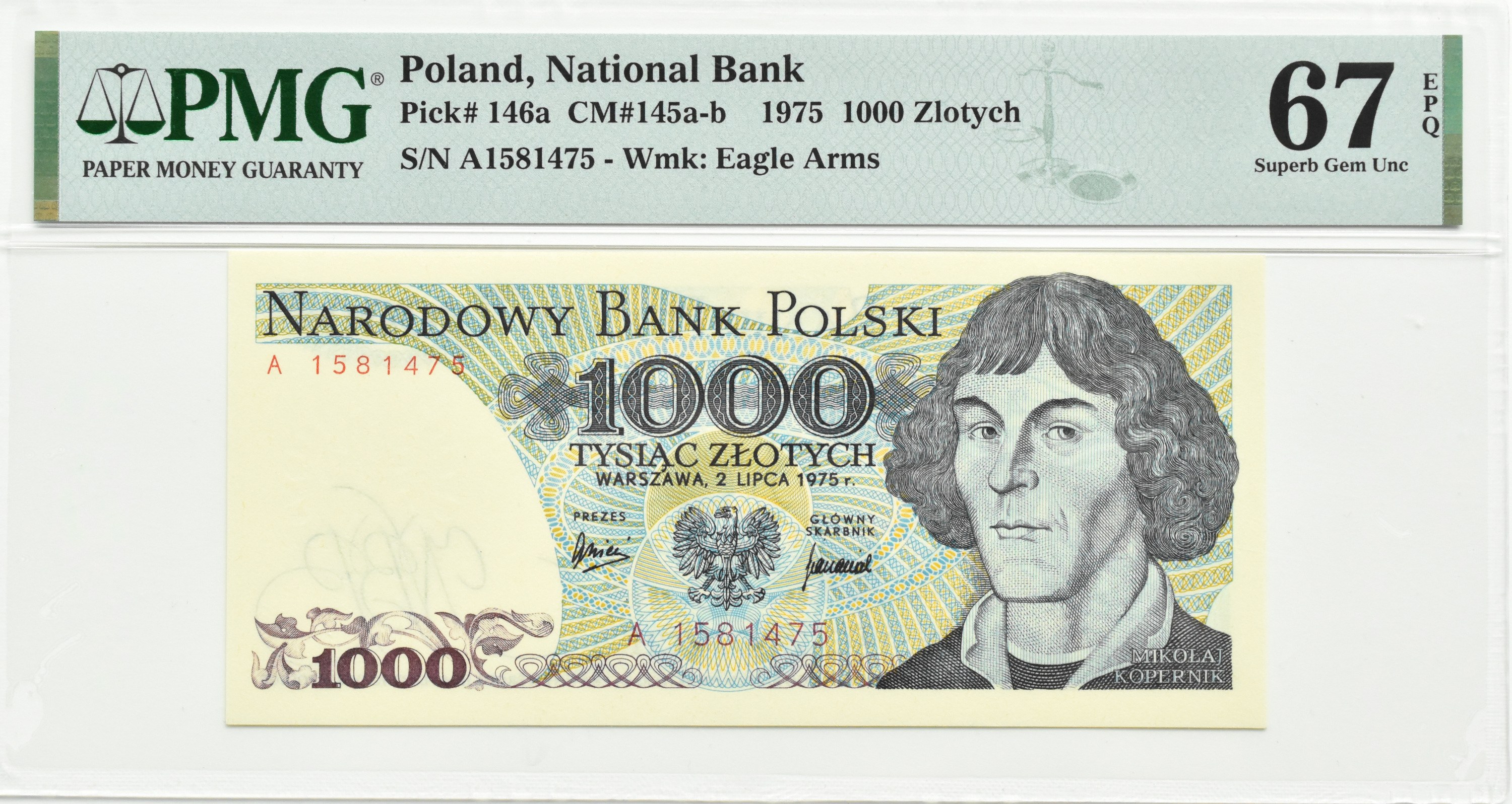 Polska, PRL, Mikołaj Kopernik, 1000 złotych 1975, seria A, Warszawa, PMG 67 EPQ