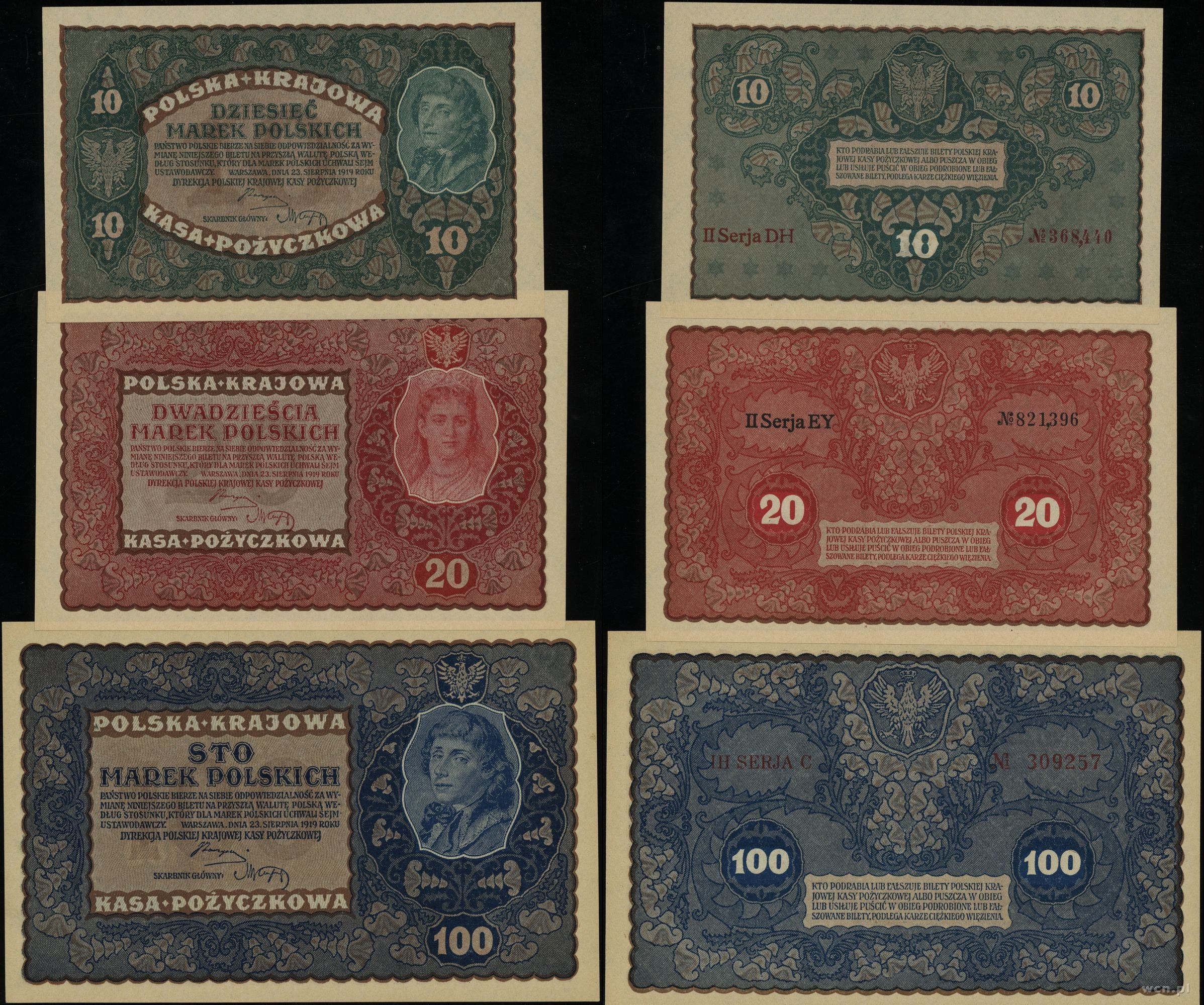 w zestawie: 10 marek polskich seria II-DH, 20 marek polskich seria II-EY, 100 marek polskich seria IH-C