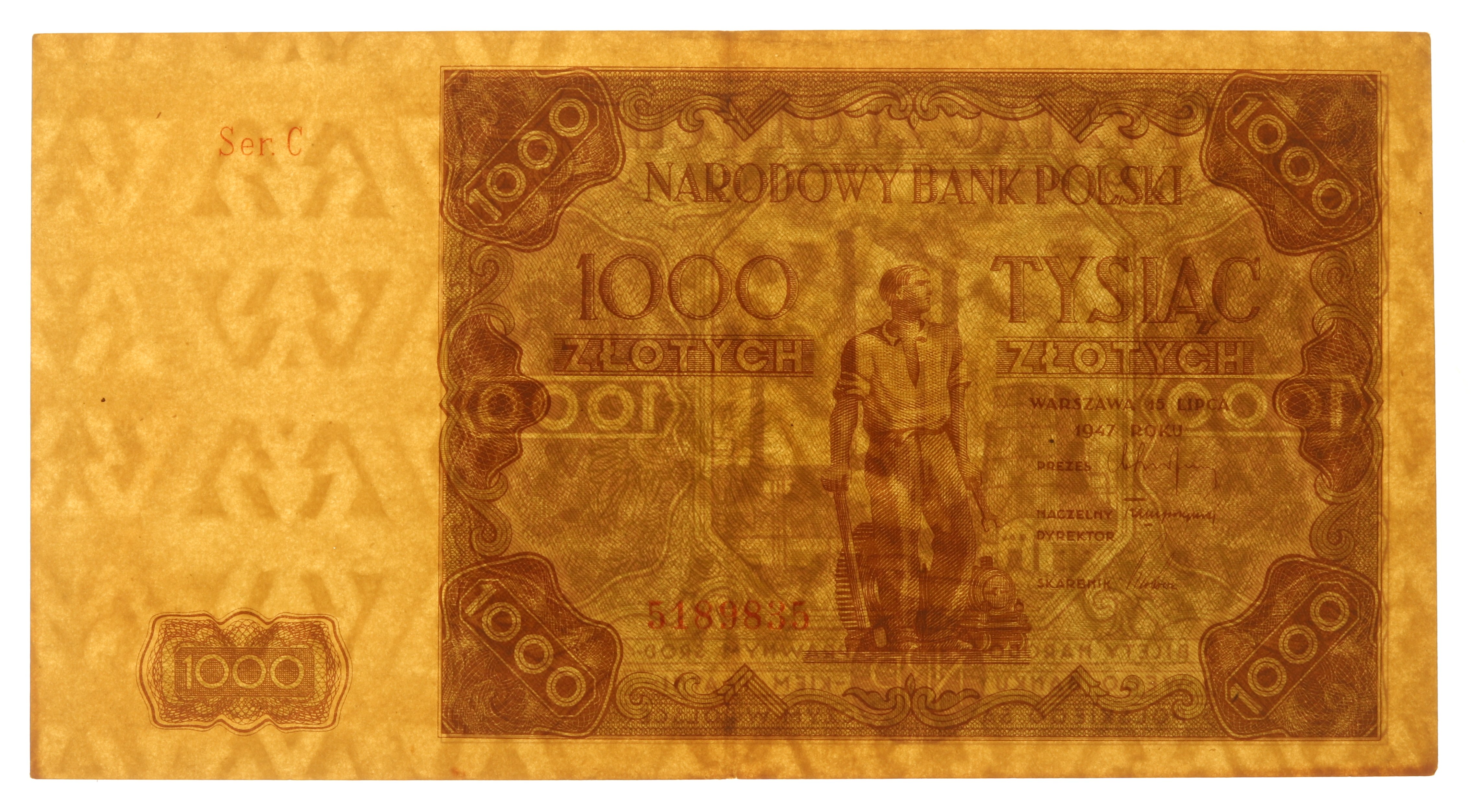 Banknot autorstwa Wacława Borowskiego, znak wodny - stylizowane naprzemiennie jaśniejsze i ciemniejsze litery W.