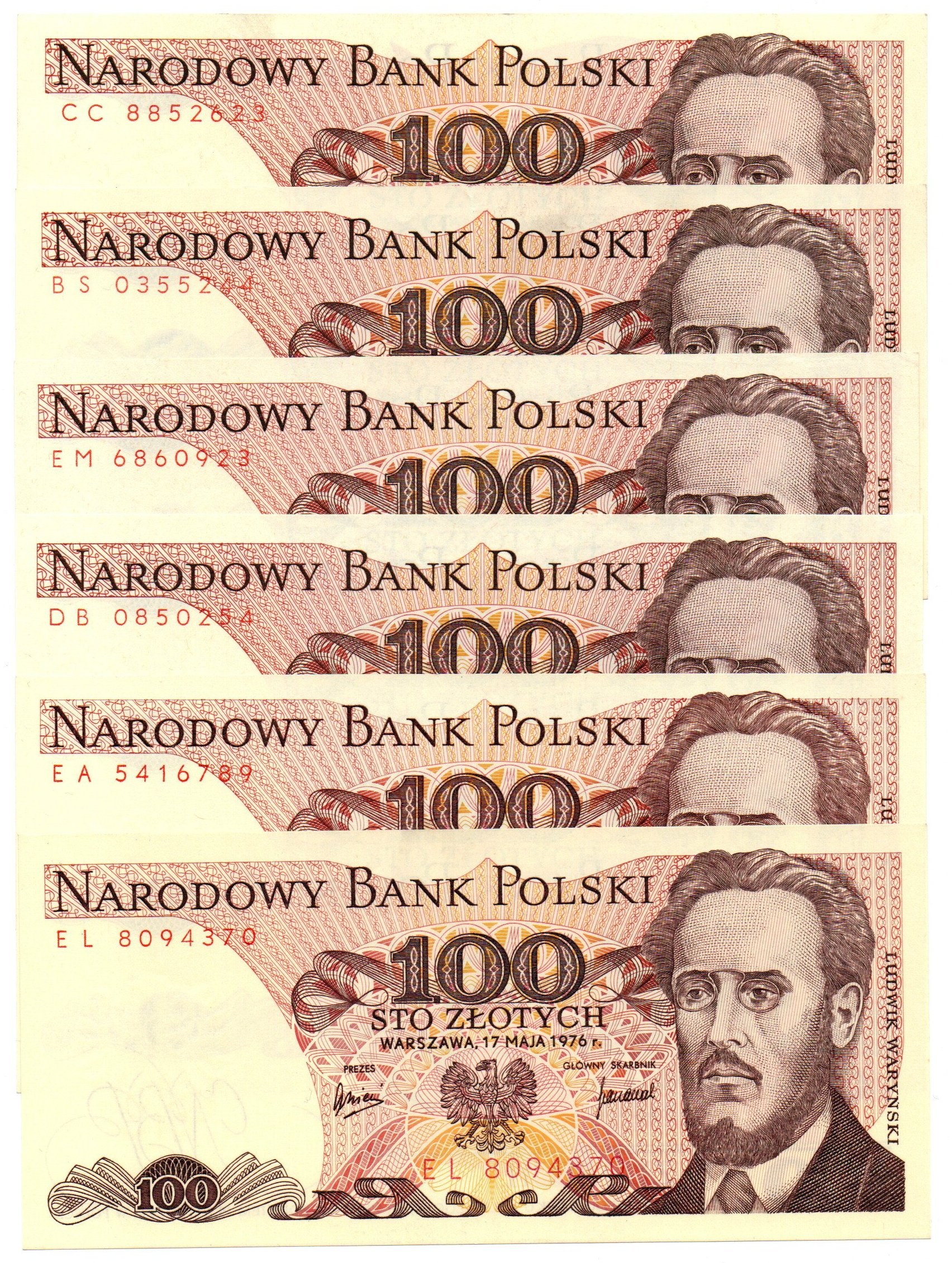 Kolekcja 6 banknotów o nominale 100 złotych z 1976 roku.