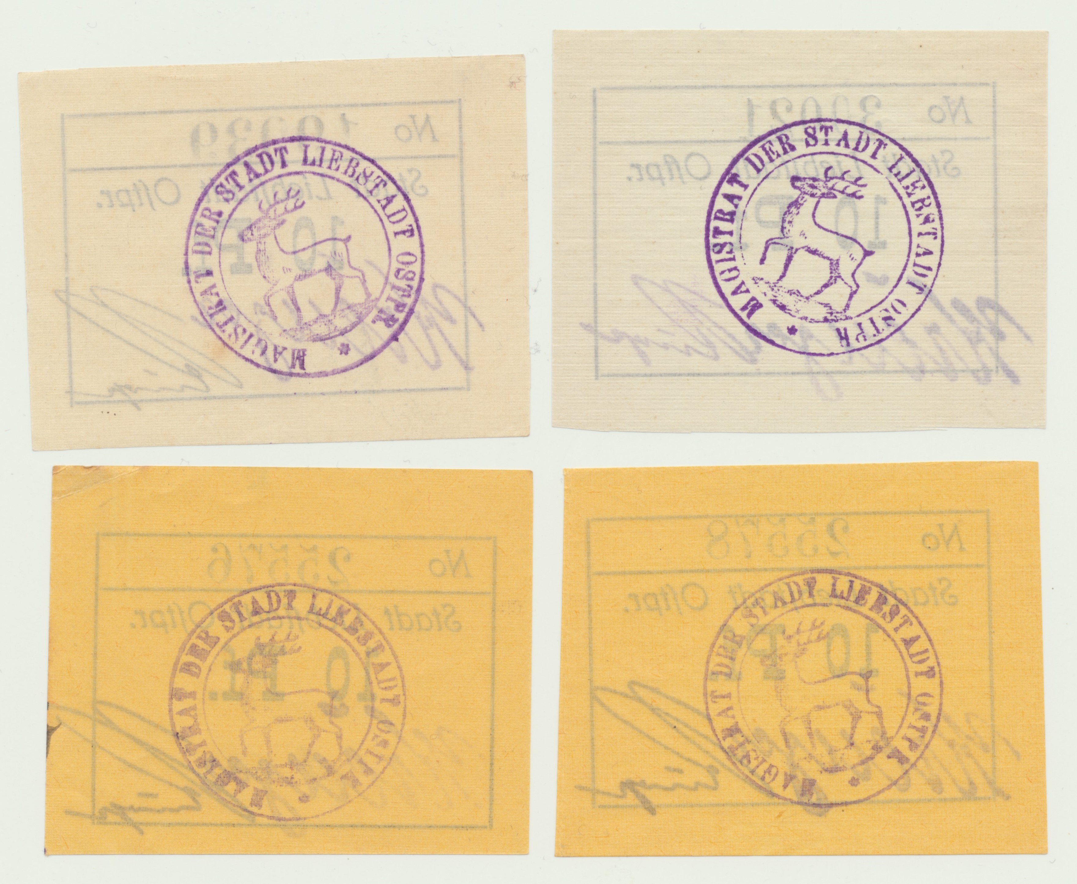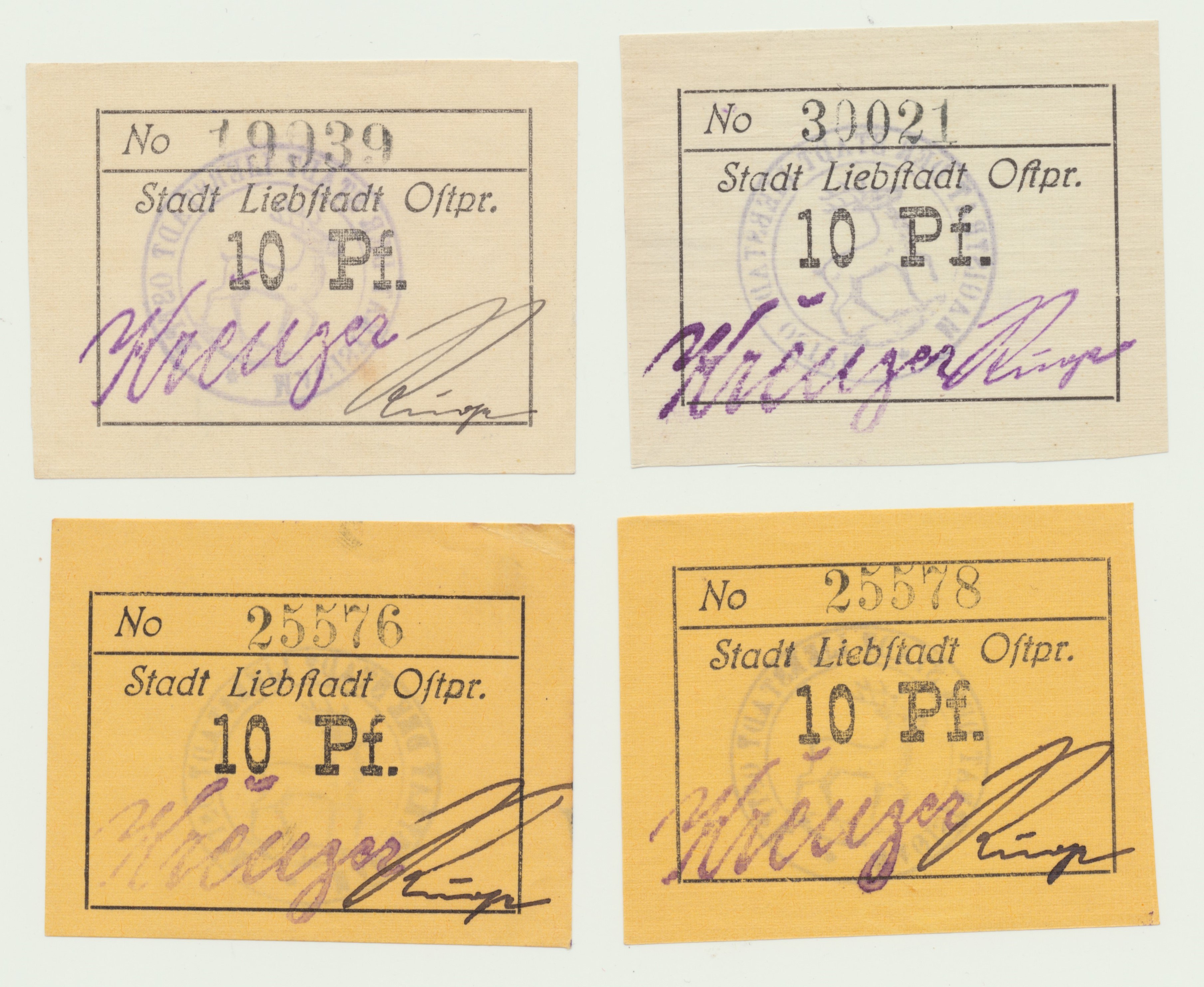 10 fenigów bez daty, papier jasnożółty, podpisy: faksymile i ręczny, cyfry numeratora małe (5,5 mm), litera f nie jest zakręcona w Pf (No 25576), miasto Miłakowo (Liebstadt), stan 1-/2+.