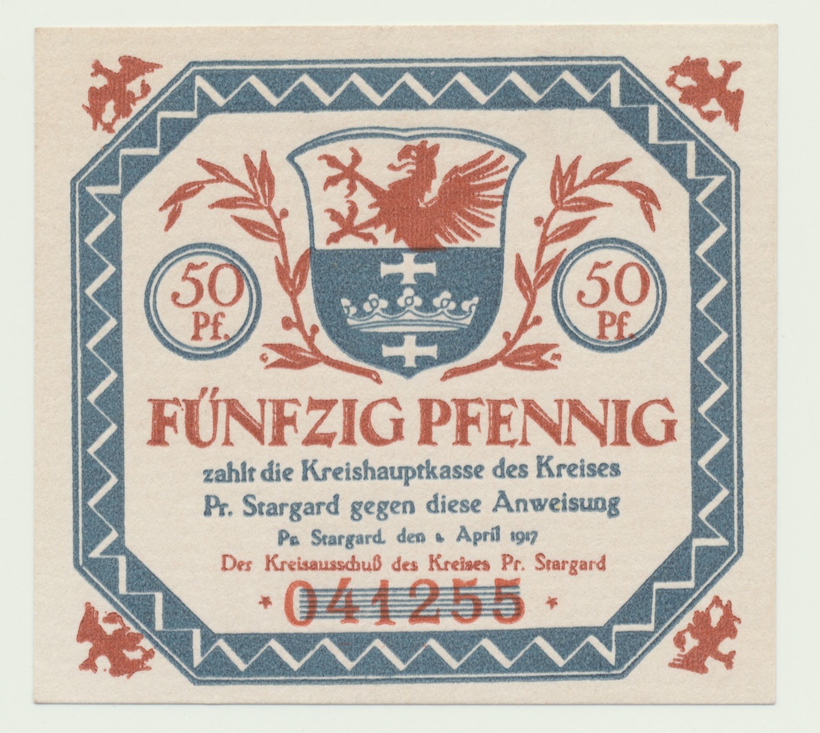 50 fenigów 1.04.1917 r. powiat Starogard Gdański (Pr. Stargard), Podczaski W-043, A.2.b, stan I, autor katalogu podaje, że ten typ banknotów zaczyna się od numeru 041300, a na tym jest numer 041255.