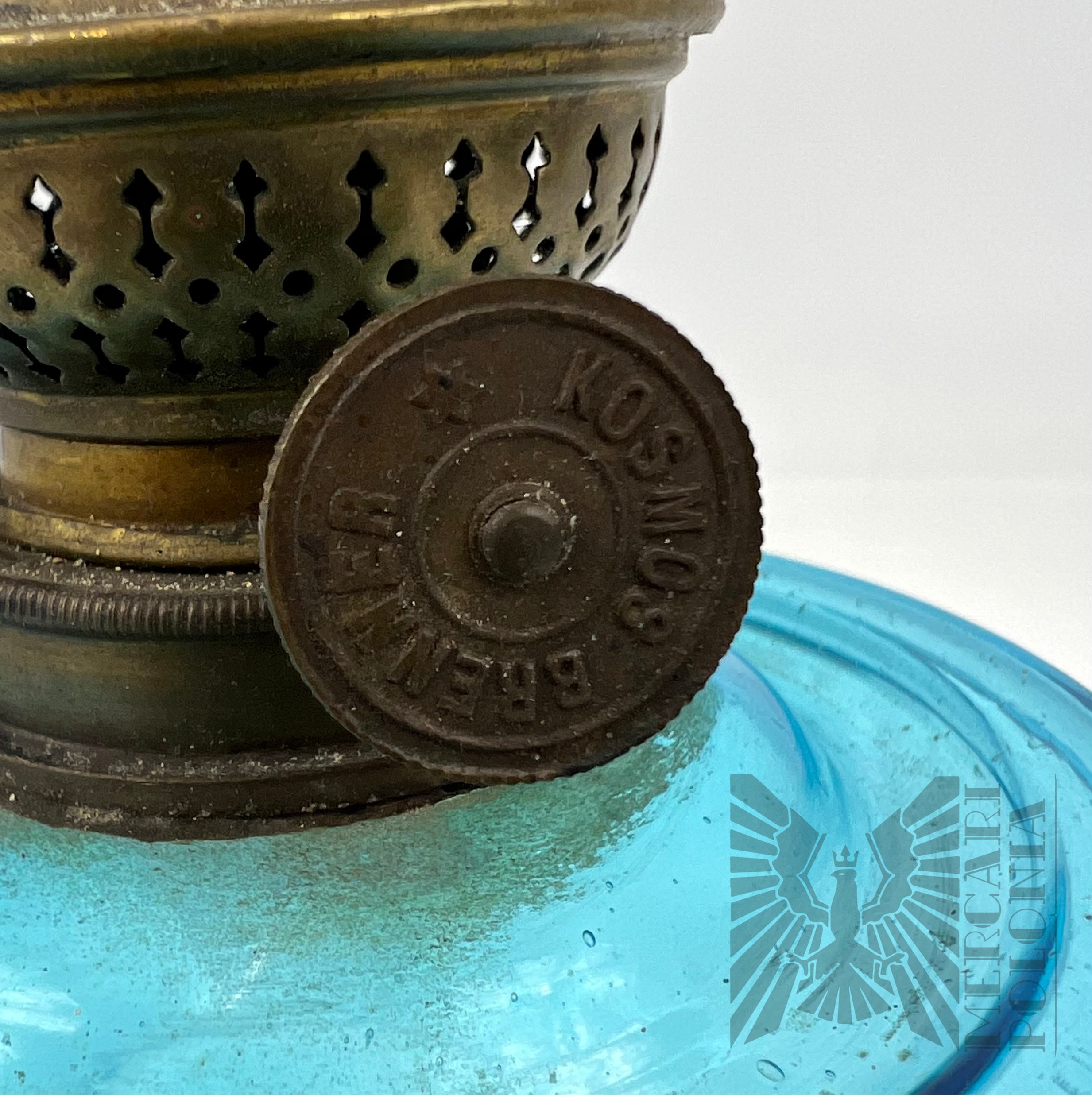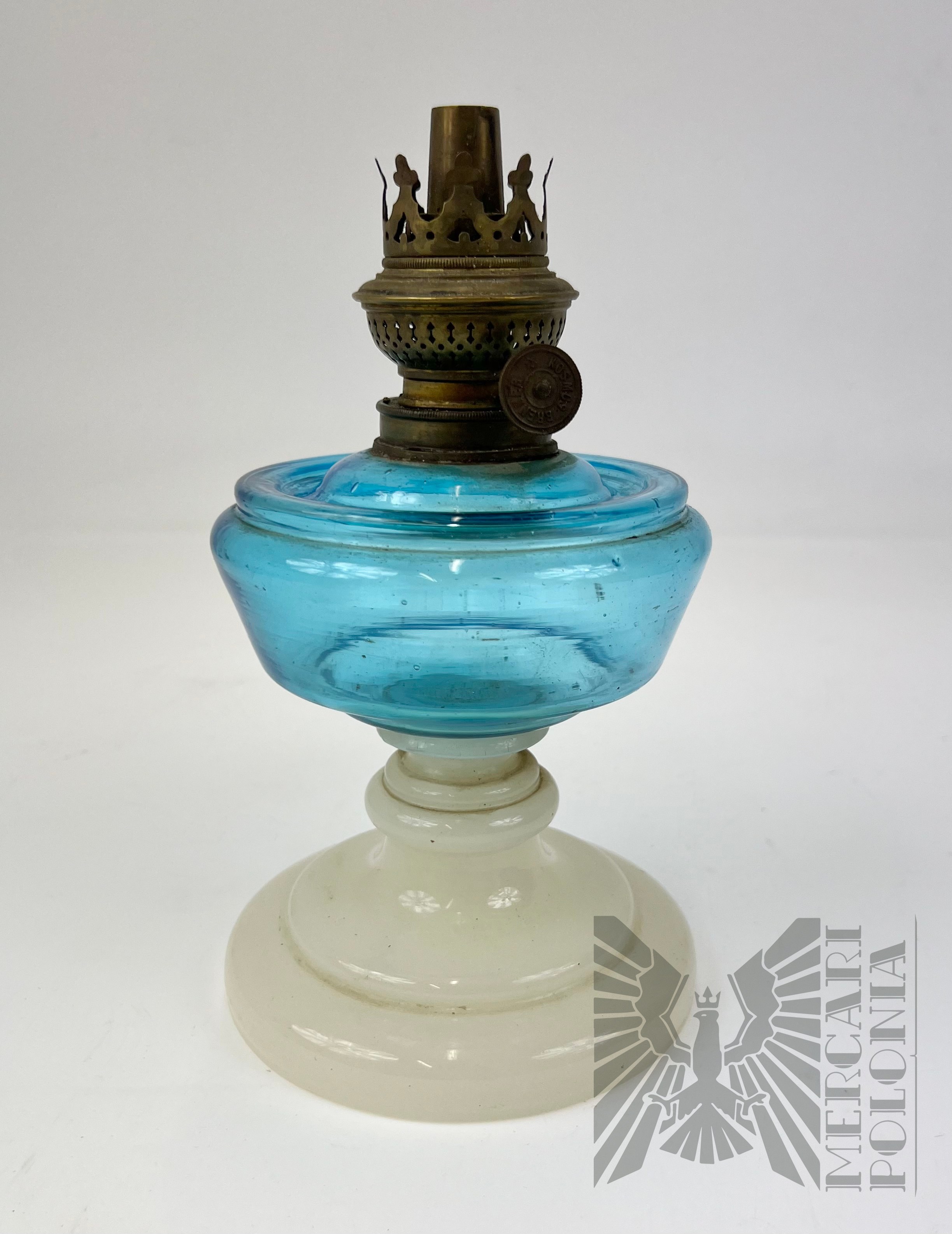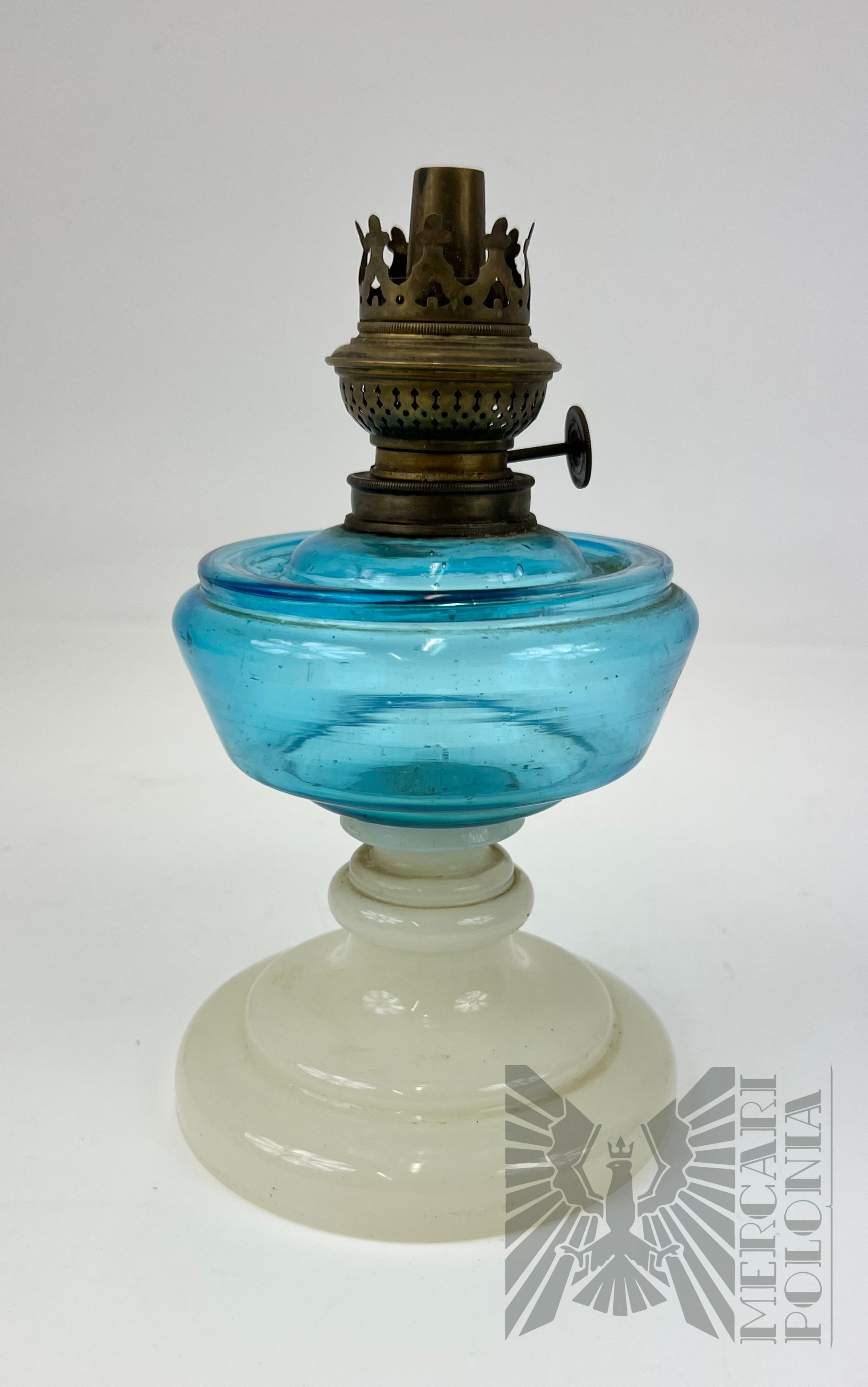 Przedwojenna lampa naftowa wykonana ze szkła, pojemnik na naftę barwiony na kolor błękitny, brak kominka.