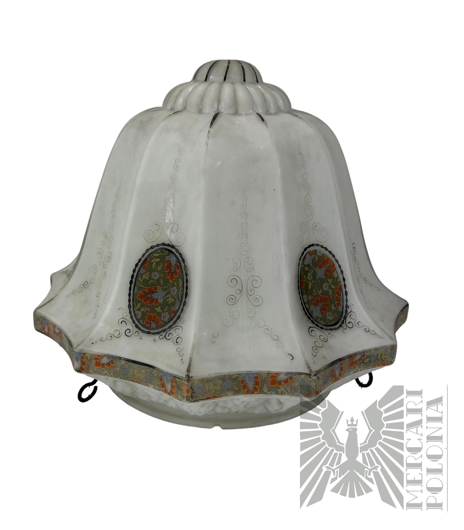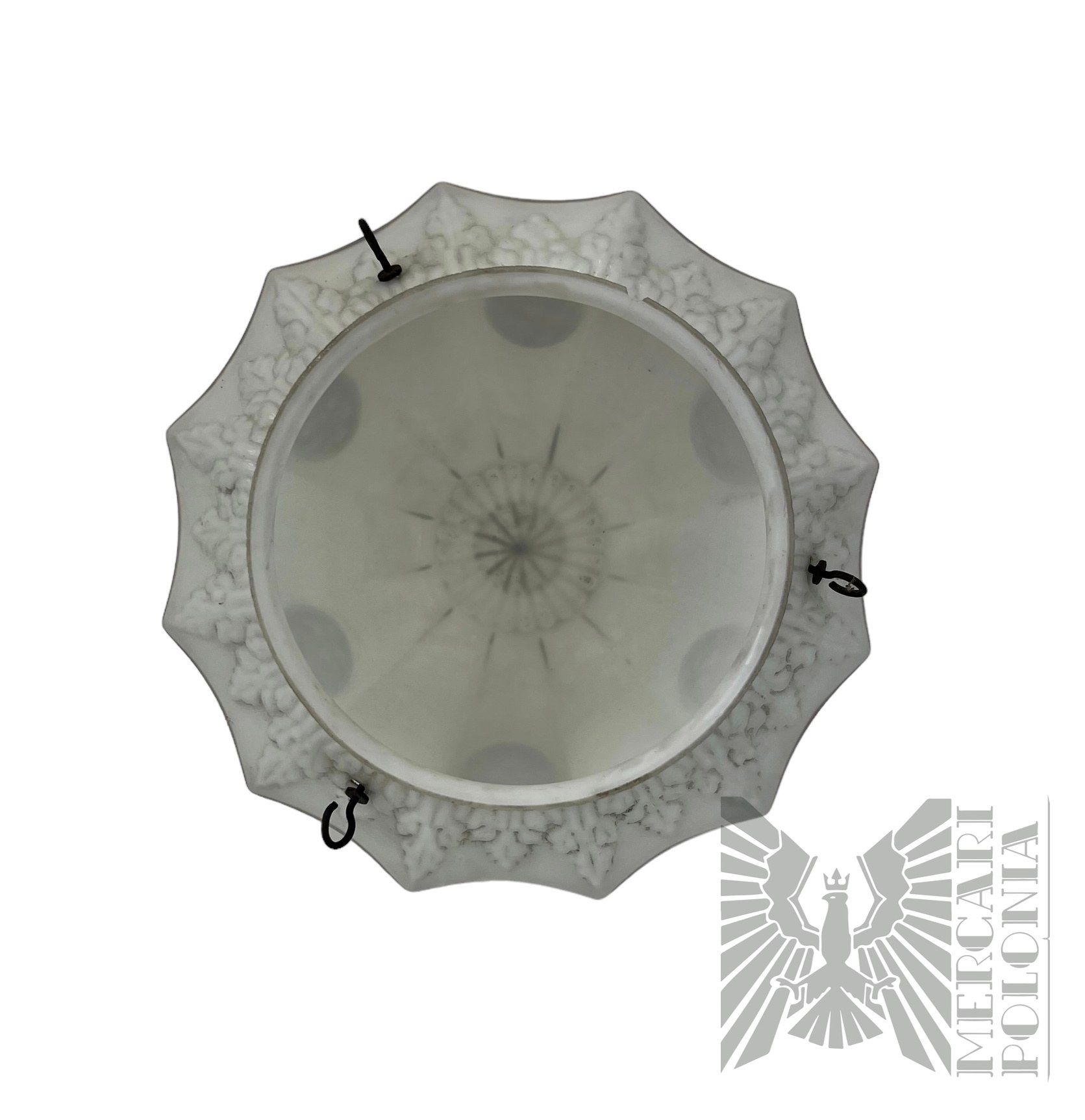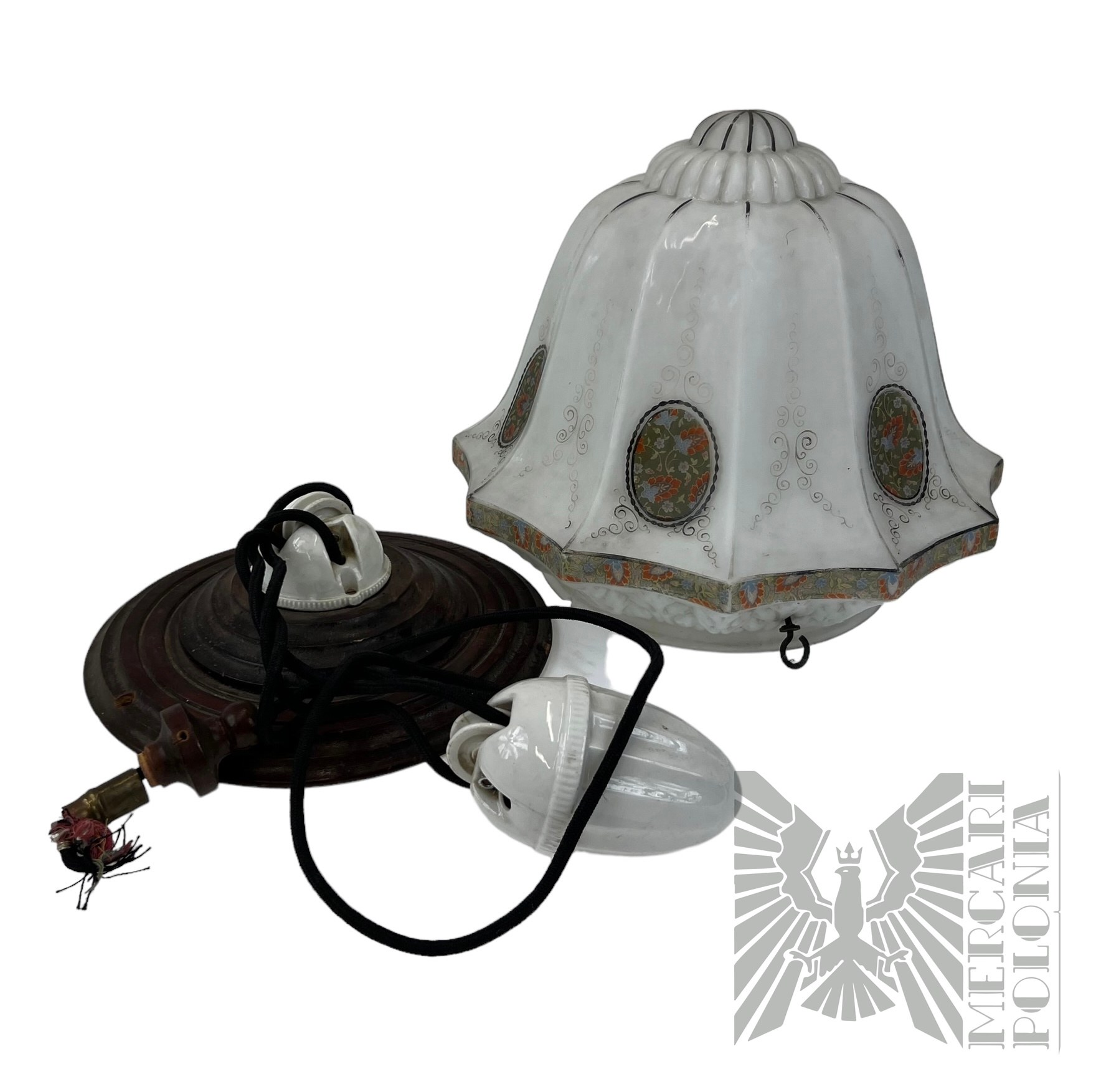 Klosz barwy białej z widocznymi zdobieniami, żyrandol kompletny z rozetą i porcelanowym odważnikiem.
