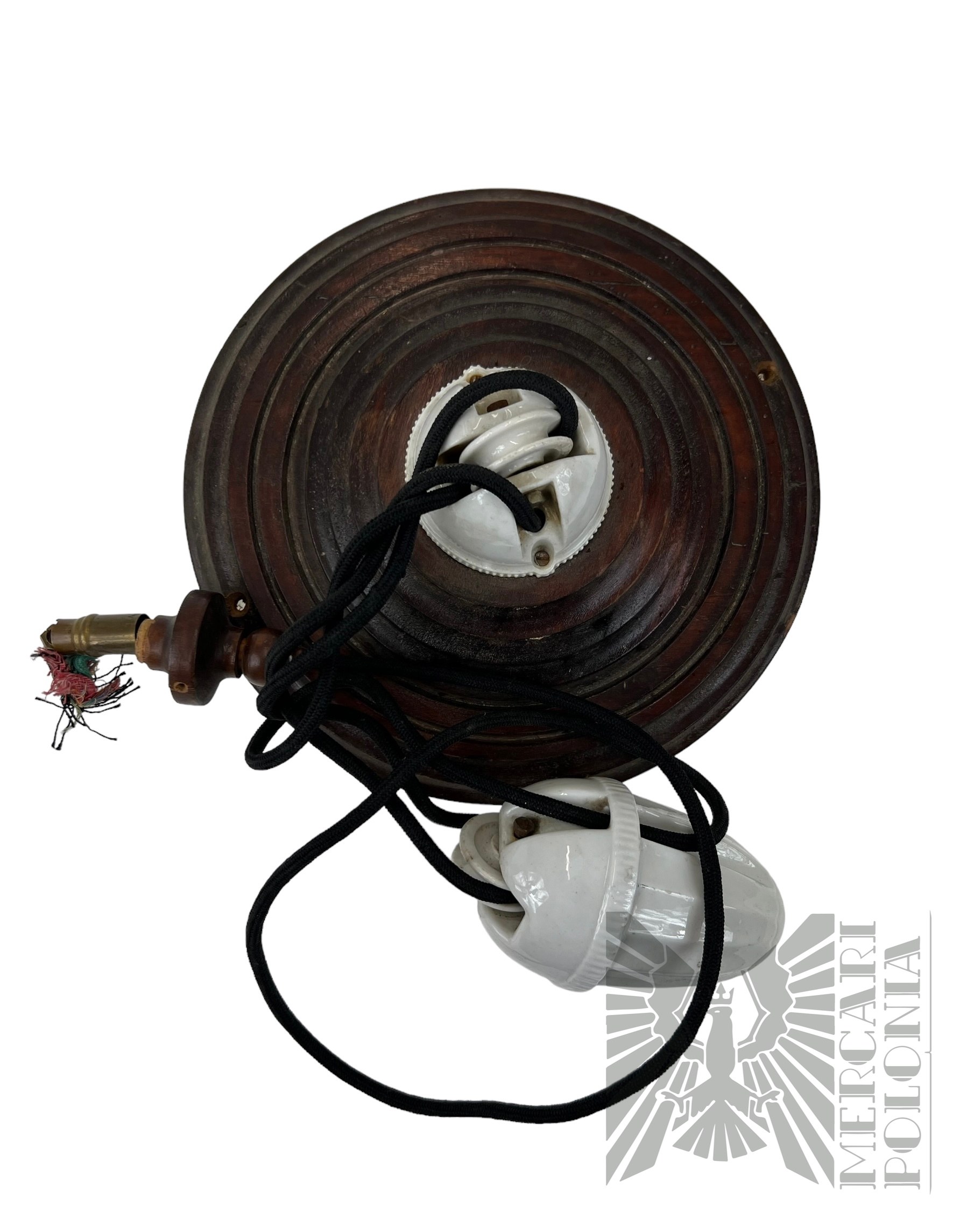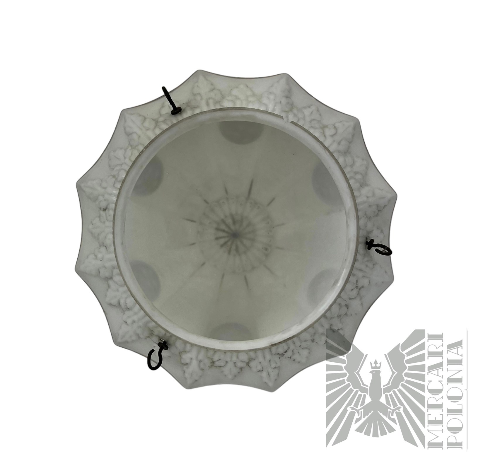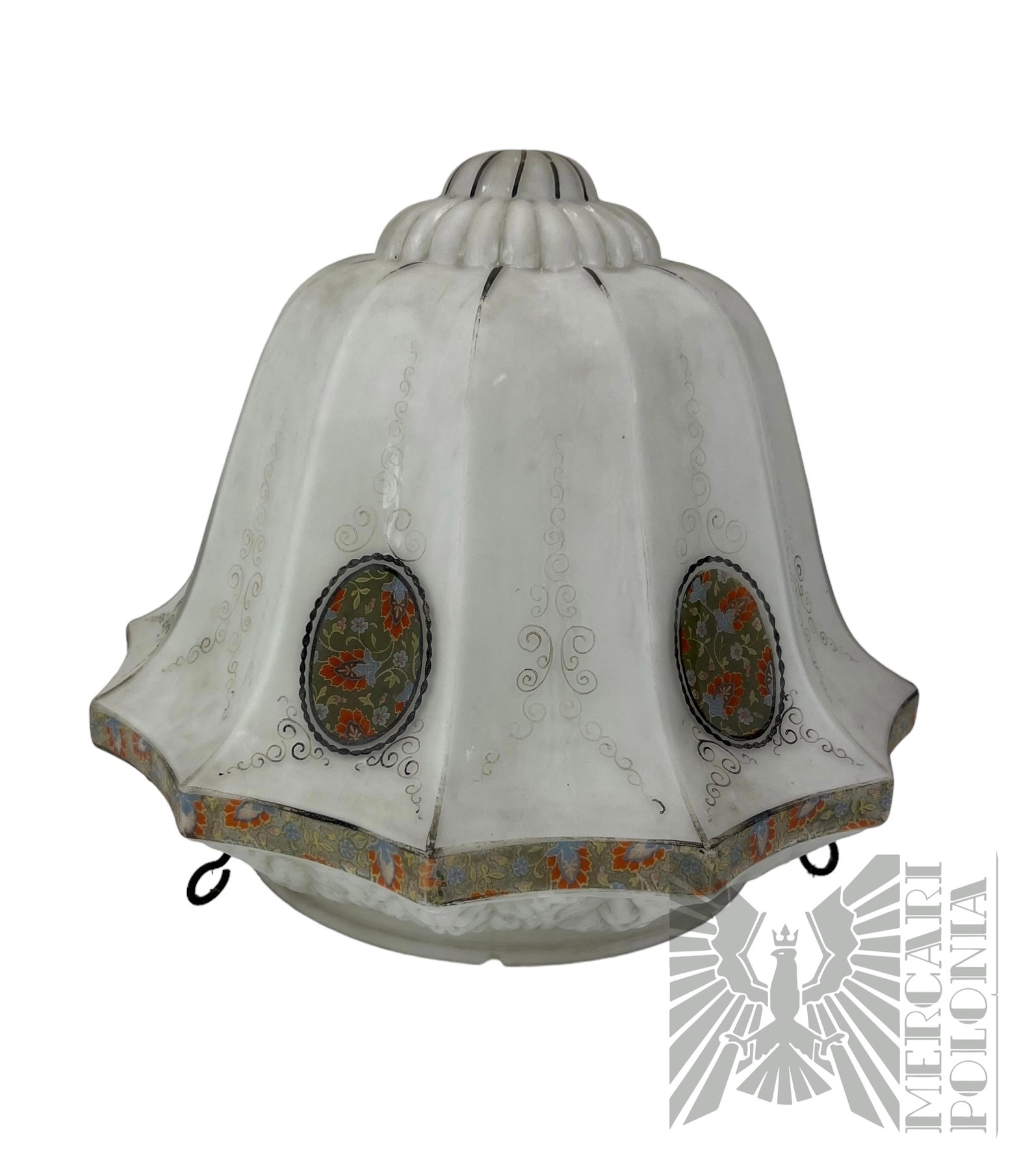 Klosz barwy białej z widocznymi zdobieniami, żyrandol kompletny z rozetą i porcelanowym odważnikiem.
