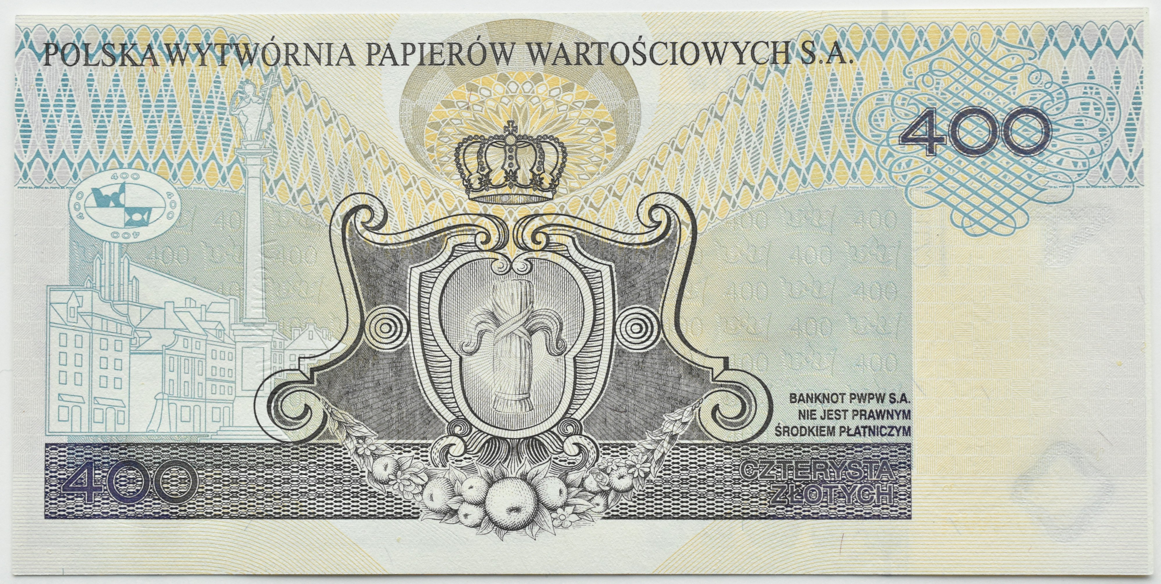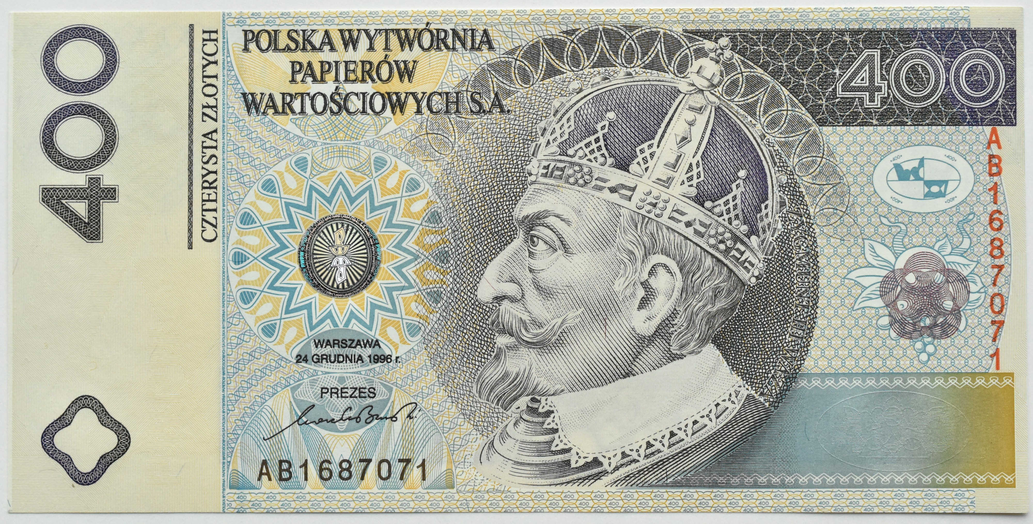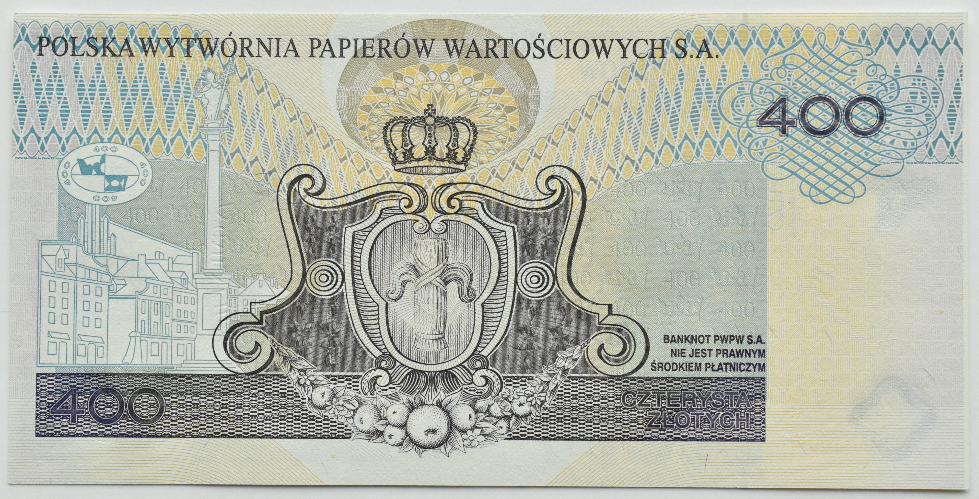 Banknot Testowy PWPW, 400 złotych 1996 Zygmunt III Waza, seria AB HOLOGRAM, UNC