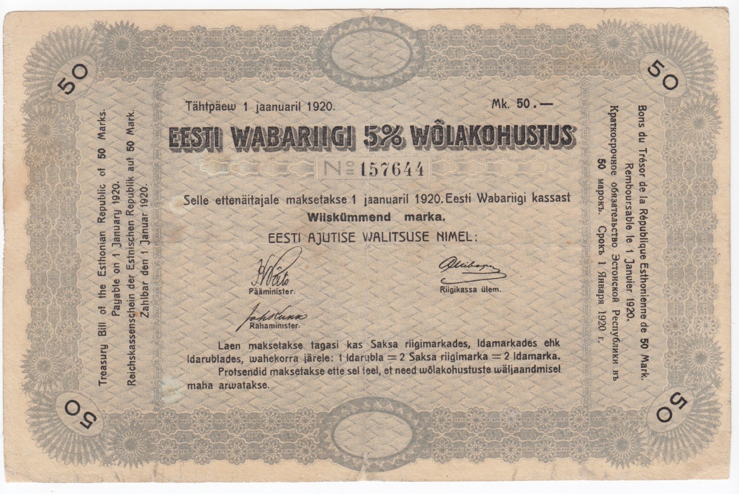 Republic of Estonia 5% government bond 50 Marka 01.01.1920