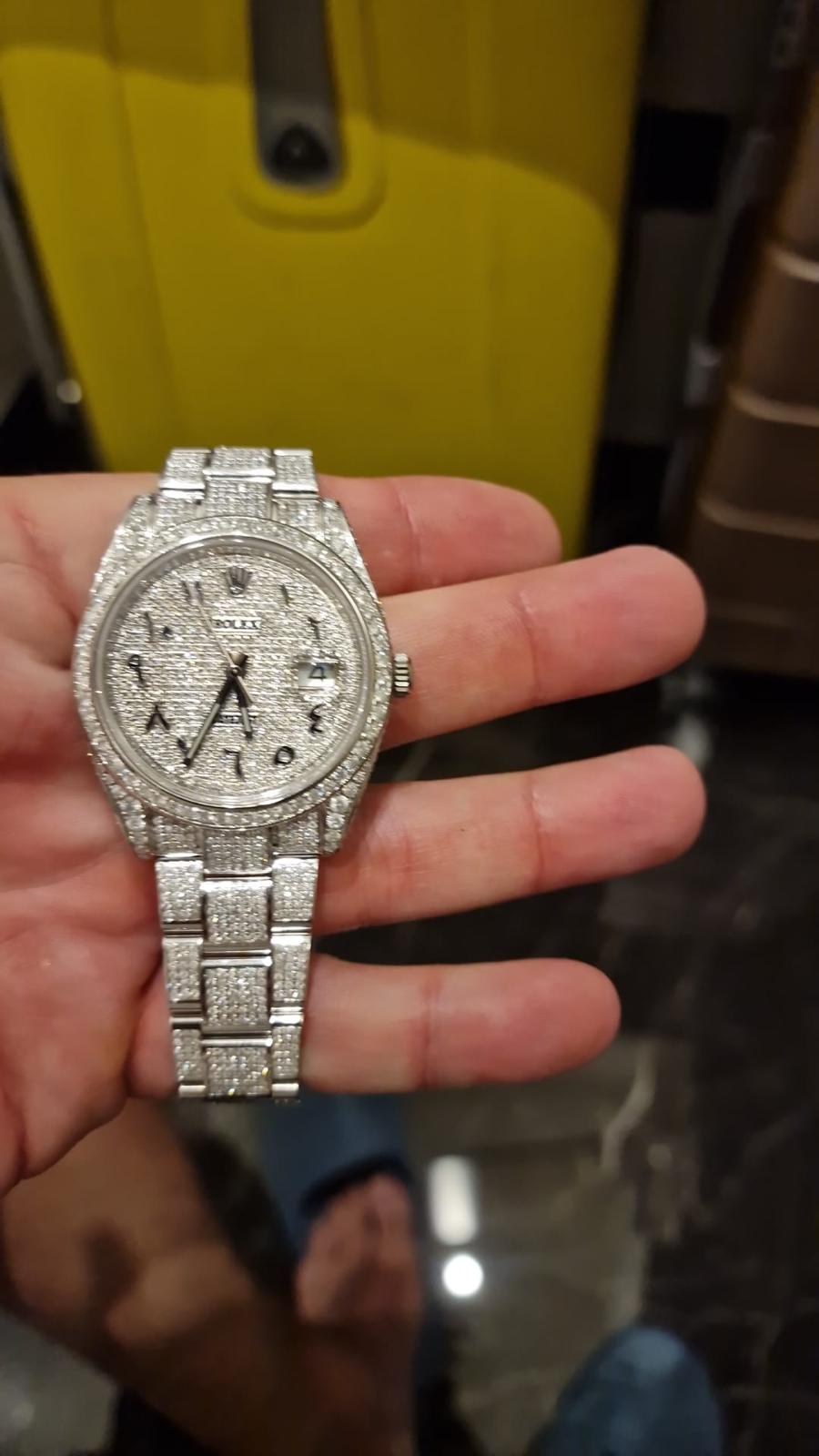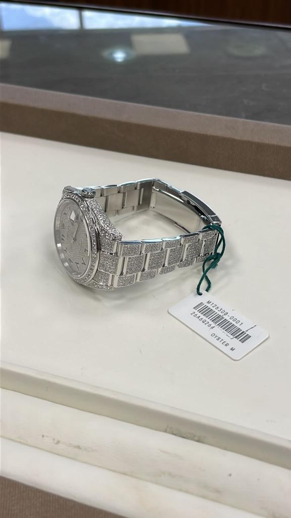 Brand Rolex Model (Watch) Datejust 41 Full Diamonds Reference number 126300 Winding Automatic Case material Steel Strap material Steel Year of production 2021 Condition Excellent (second hand, no or barely visible signs of wear) Kit With original documents, no box Charge Automatic Case material Steel Diameter 41 x 48 mm Waterproof 10 ATM Bezel material Steel covered with diamonds Sapphire glass Dial Diamonds Arabic numerals Numbers on the dial Without numbers Strap Strap material Steel covered with diamonds Strap color Steel Folding clasp Clasp material Steel Functions Date |