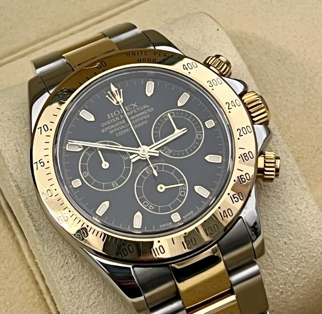 Brand Rolex Model (Watch) Daytona Reference number 116523 Winding Automatic Case material Gold/Steel Strap material Gold/steel Year of production 2005/2005 Condition Excellent (second hand, no or barely visible signs of wear) Original documents included, no box Warranty Rolex Winding Automatic Case Case material Gold/Steel Diameter 40 mm Waterproof 10 ATM Bezel material Yellow gold Sapphire glass Black dial Numbers on the dial Without numbers Strap Strap material Gold/steel Strap color Gold/steel Folding clasp Clasp material Gold/Steel Functions Chronograph Other Small seconds, Luminous hands, Screw-down crown, Screw-down pushers, Luminous indices |