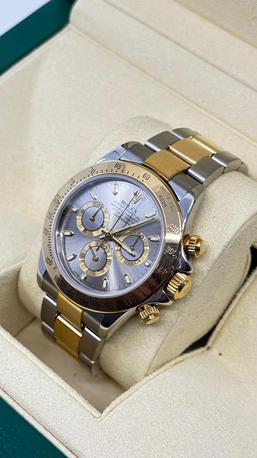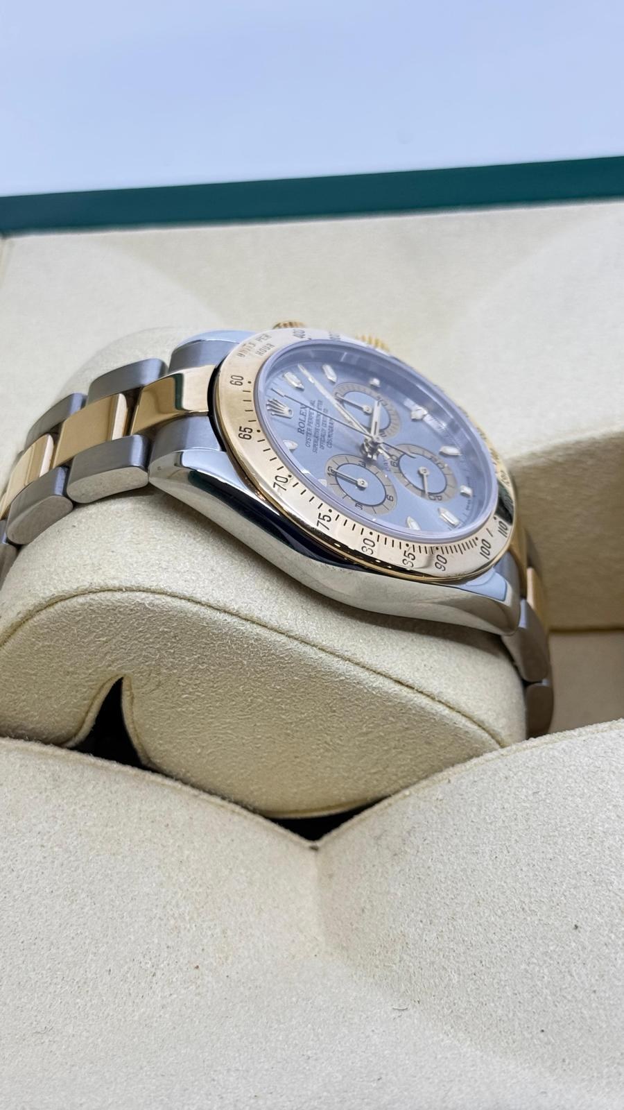 BRAND ROLEX MODEL (WATCH) DAYTONA REFERENCE NUMBER 116523 MOVEMENT AUTOMATIC CASE MATERIAL GOLD/STEEL STRAP MATERIAL GOLD/STEEL YEAR 2005 ORIGINAL ROLEX PAPERS, NO BOX, THE BOX IS USED ONLY FOR PHOTOGRAPHS IS NOT FOR SALE CALIBER MOVEMENT AUTOMATIC CASE CASE MATERIAL GOLD/STEEL DIAMETER 40 MM WATER RESISTANT 10 ATM BEZEL MATERIAL YELLOW GOLD GLASS SAPPHIRE CRYSTAL STRAP STRAP MATERIAL GOLD/STEEL STRAP COLOR GOLD/STEEL CLASP DÉPLOYANTE CLASP MATERIAL GOLD/STEEL FUNCTIONS CHRONOGRAPH - AUCTION COMMISSION 25%