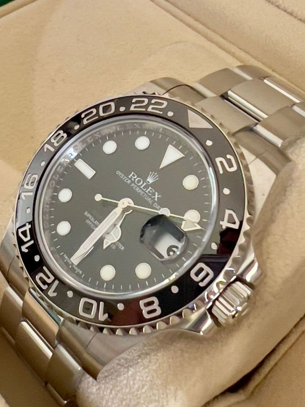 Brand Rolex Model (Watch) GMT-Master II Reference number 116710LN Winding Automatic Case material Steel Strap material Steel Year of production 2008 EXCELLENT condition Original documents set, NO BOX Rolex warranty Winding Automatic Case material Steel Diameter 40 mm Waterproof 10 ATM Bezel material Ceramic Sapphire glass Dial Black Numbers on the dial Without numbers Strap Material Steel Strap color Steel Folding clasp Clasp material Steel Functions Date, GMT |