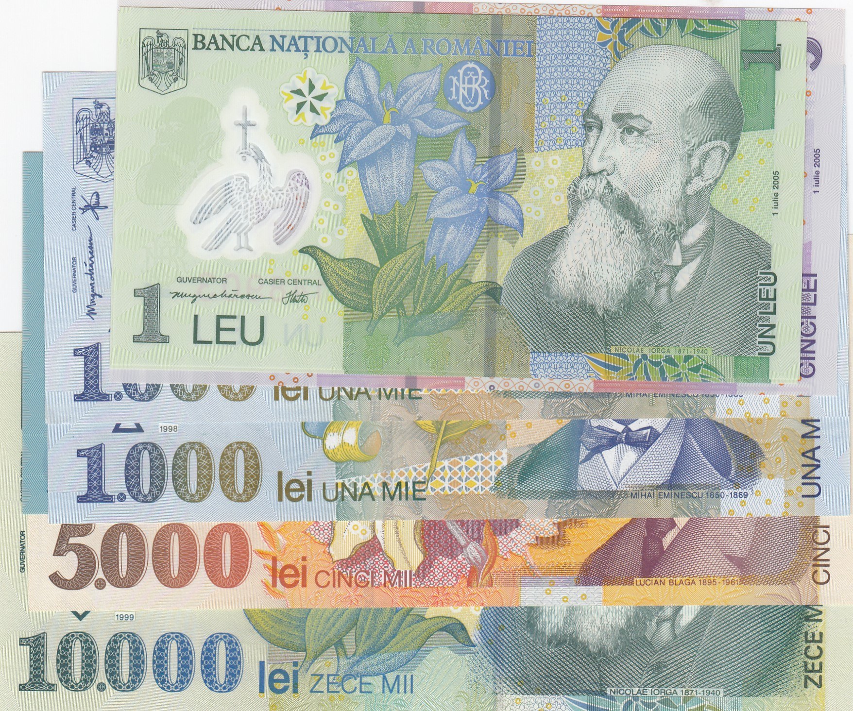 Romania, 1 Leu (2), 5 Lei, 1000 Lei (2), 2000 Lei, 5000 Lei and 10000 Lei, 1998/2005, UNC, (Total 8 banknotes)