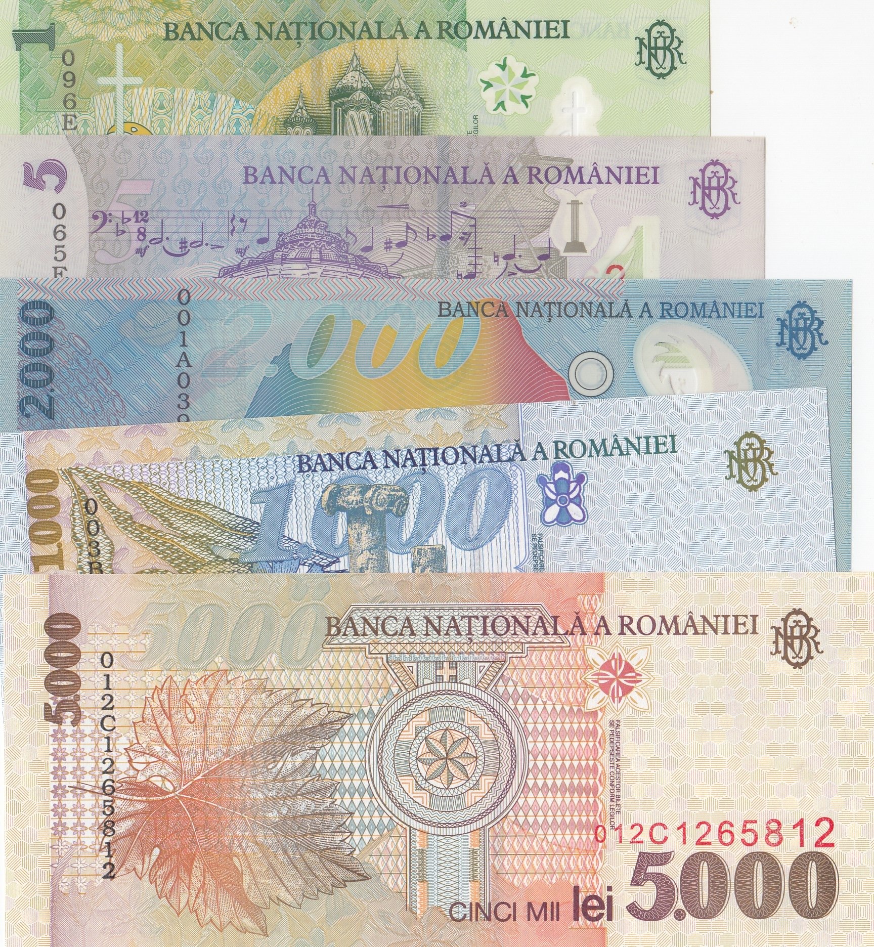 Romania, 1 Leu, 5 Lei, 1.000 Lei, 2.000 Lei and 5.000 Lei, 1998/2005, UNC, (Total 5 banknotes)