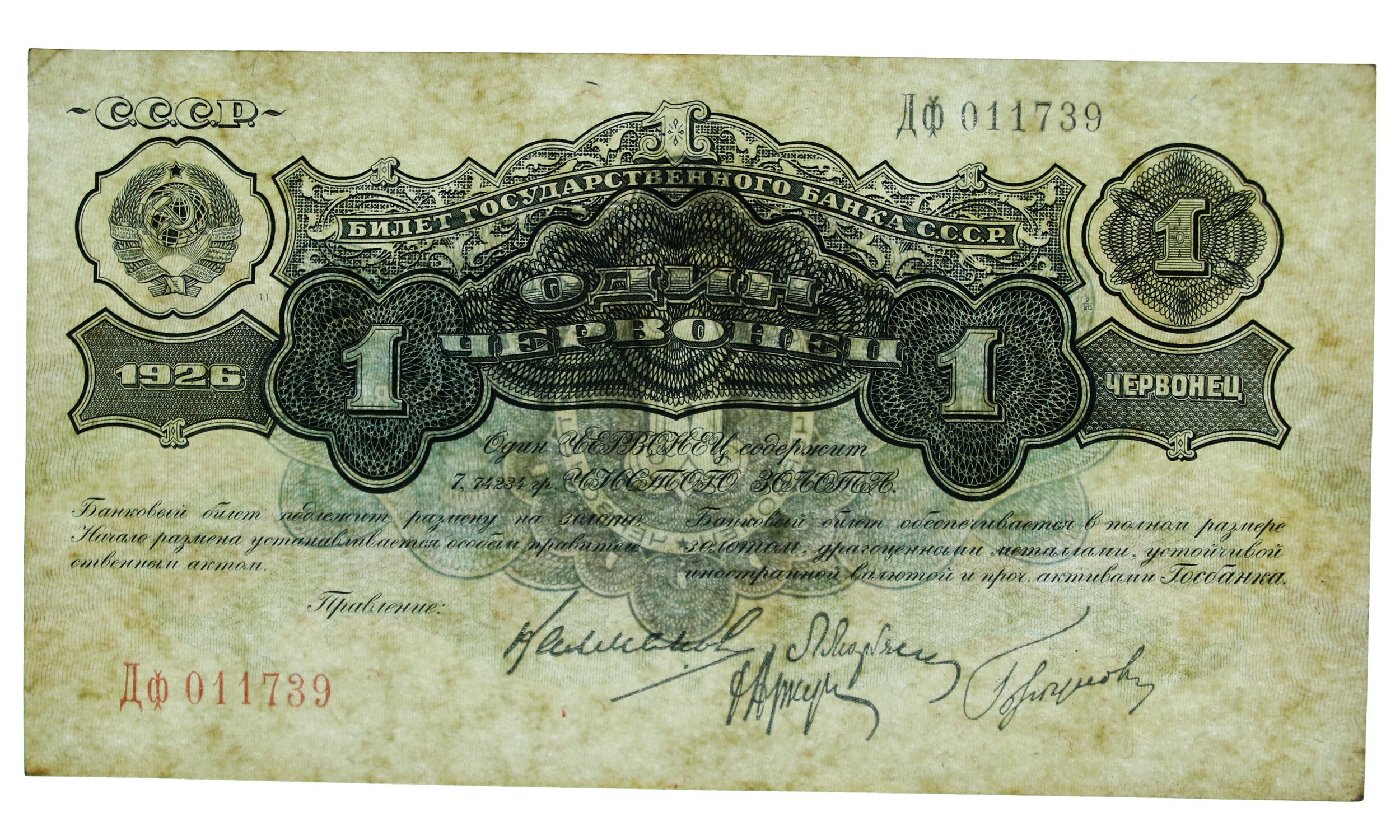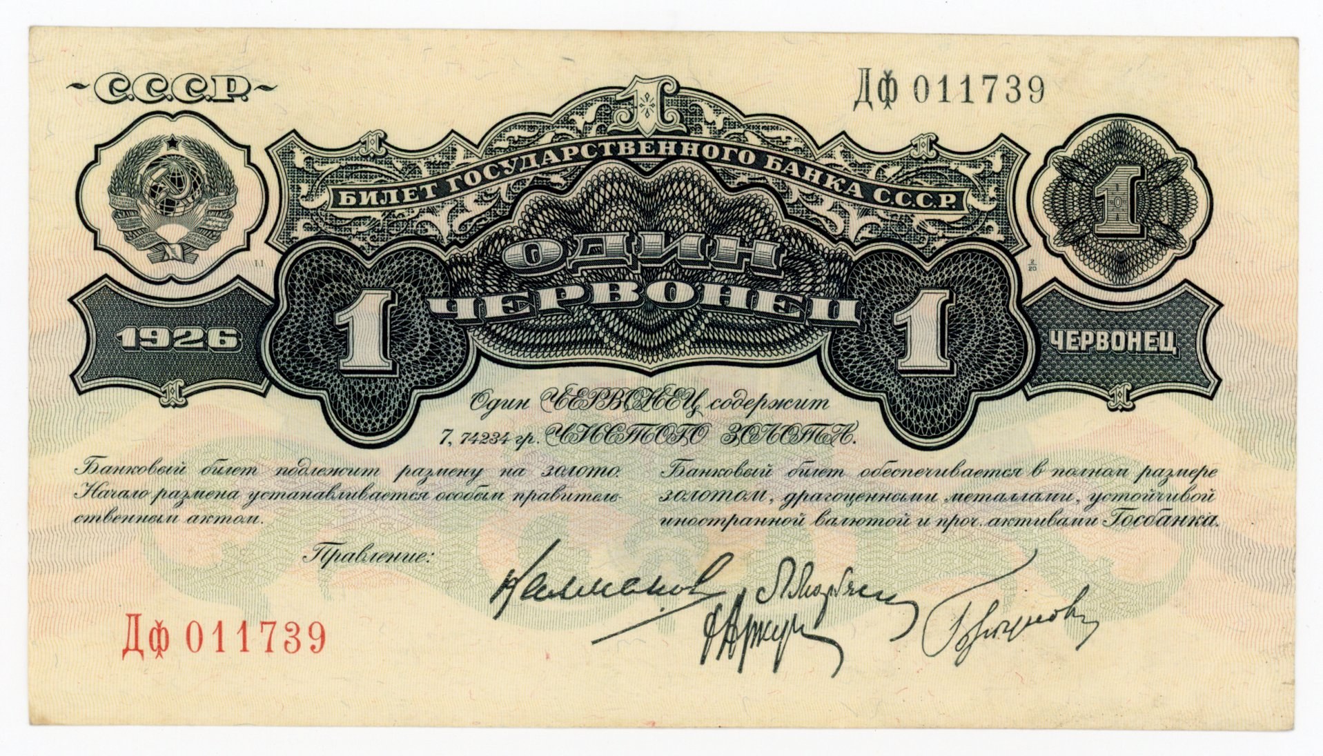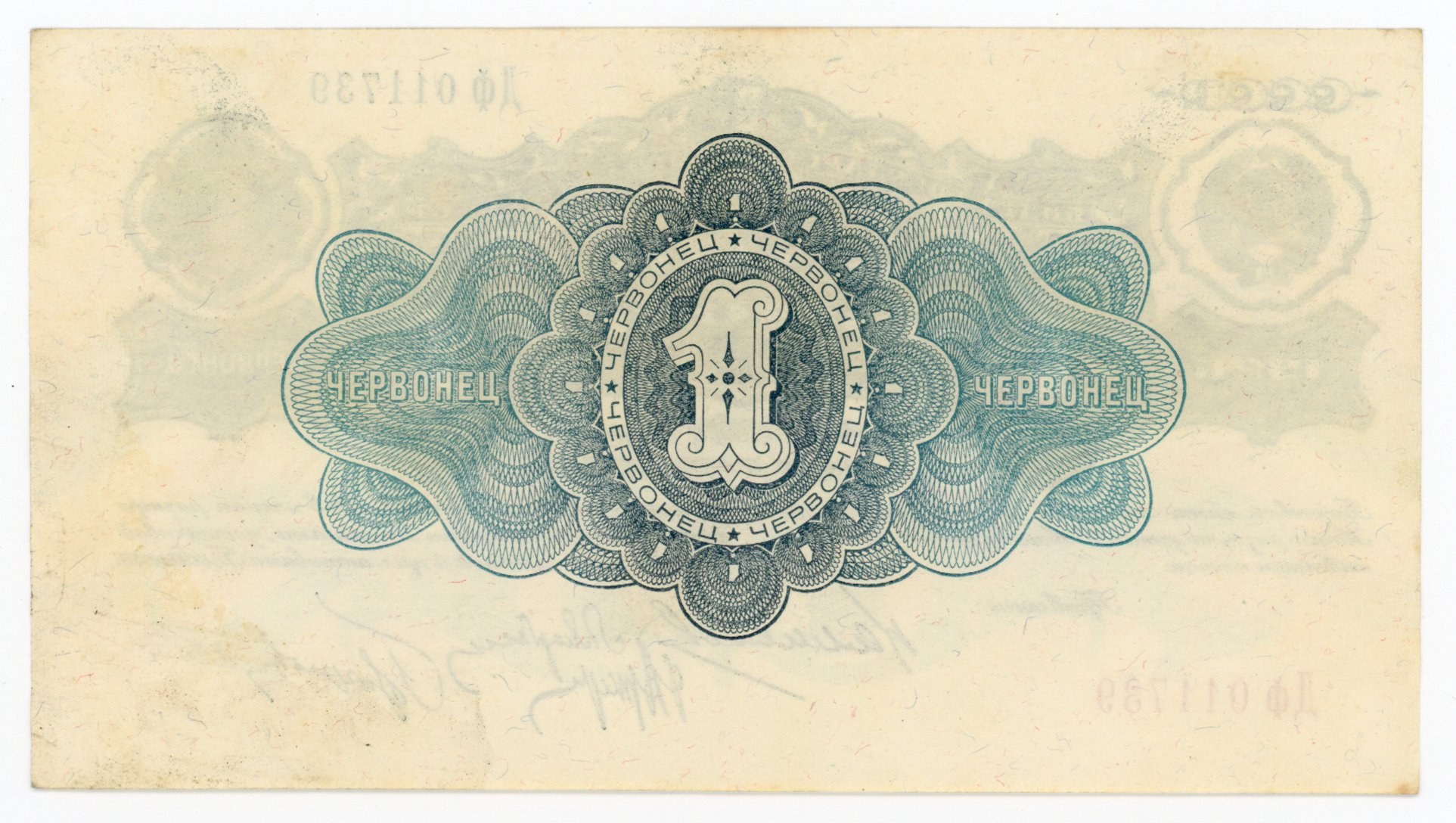 Rosja, ZSRR, 1 czerwoniec 1926. Stan zachowania: 1/1-. Mała zgniotka papieru po prawej stronie oraz złamany mały lewy górny róg. Bardzo dobrze zachowane. Literatura: Pick 198 d