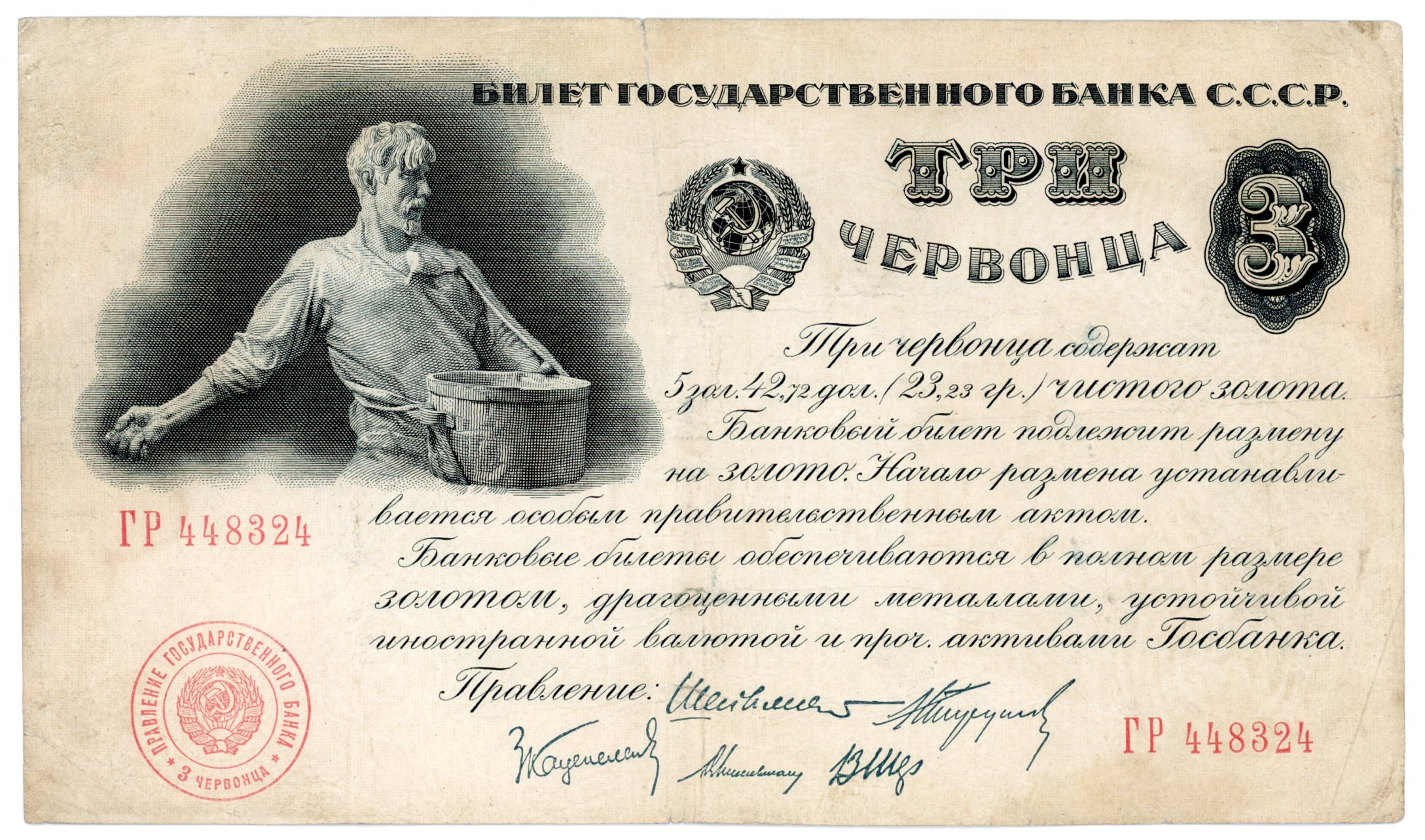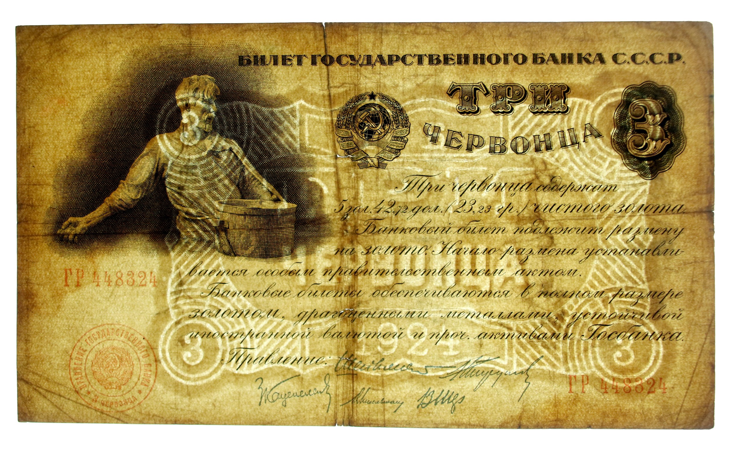 Rosja, ZSRR, 3 czerwońce 1924. Stan zachowania: 3. Kilkukrotnie złamane. Rzadkie. Literatura: Pick 197