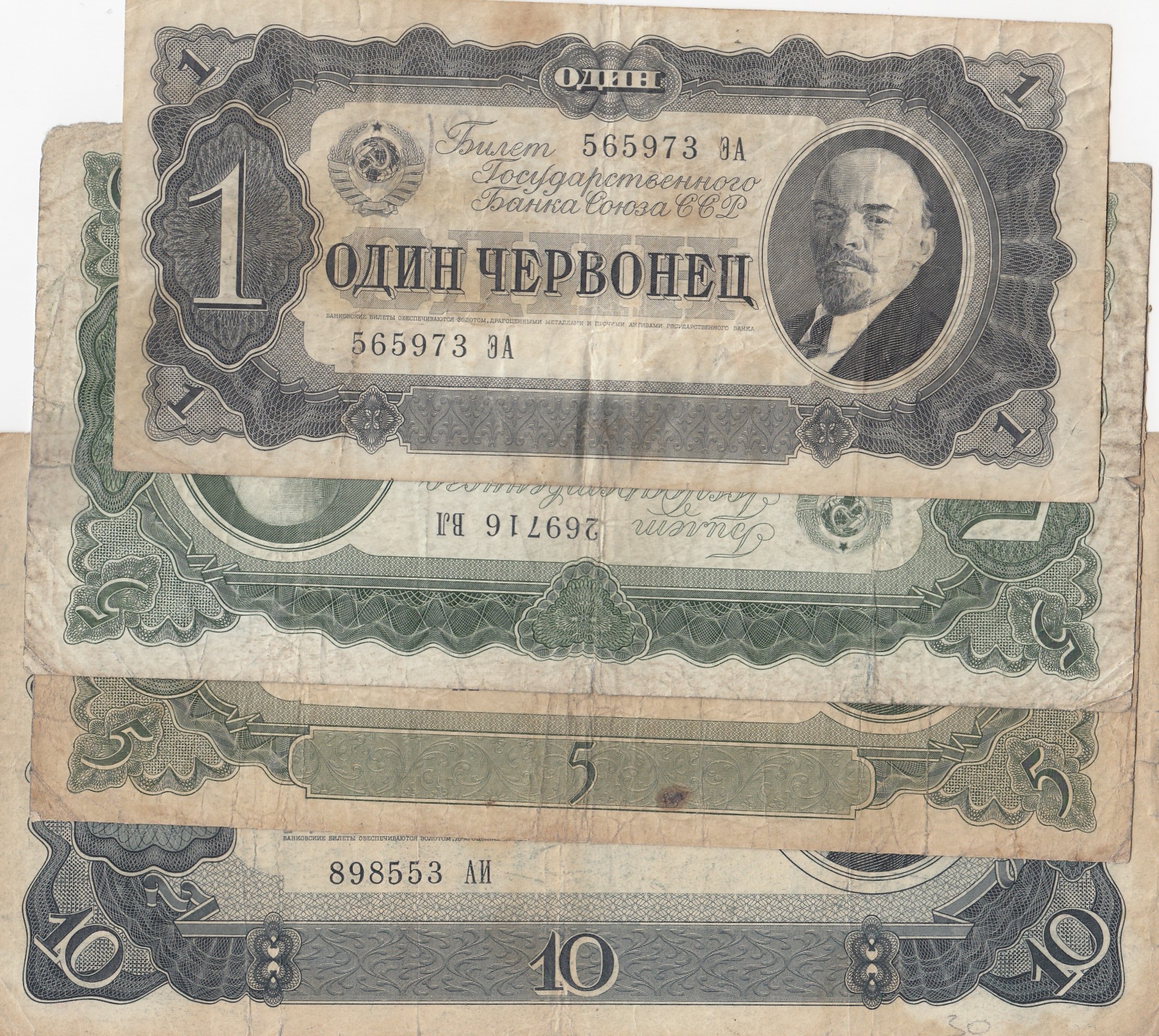 Russia, 1 Chervonetz, 5 Chervontsev (2) and 10 Chervontsev, 1937, POOR / VF, p202, p204, p205, (Total 4 banknotes)