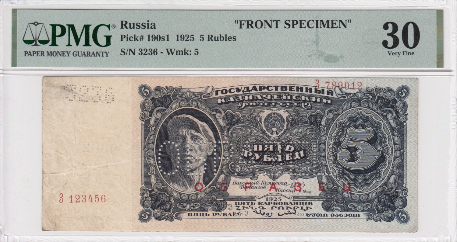 Russia 5 Rubles 1925 - FRONT SPECIMEN - PMG 30 Very Fine
