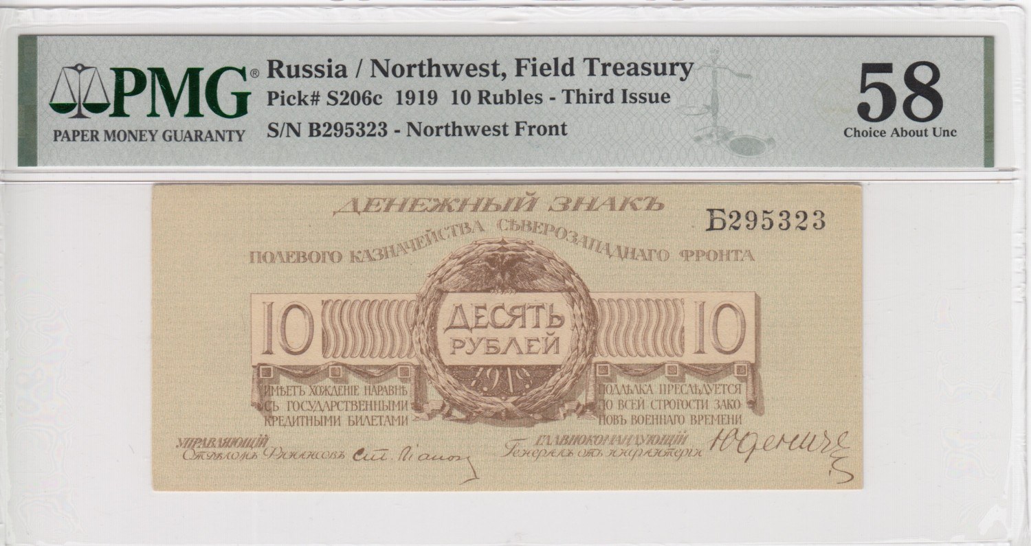 Russia (Northwest Russia) 10 Roubles 1919 - PMG 58 Choice About Unc